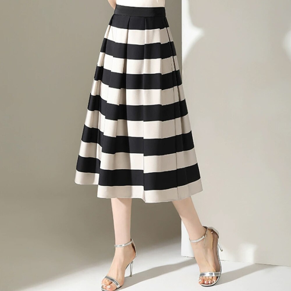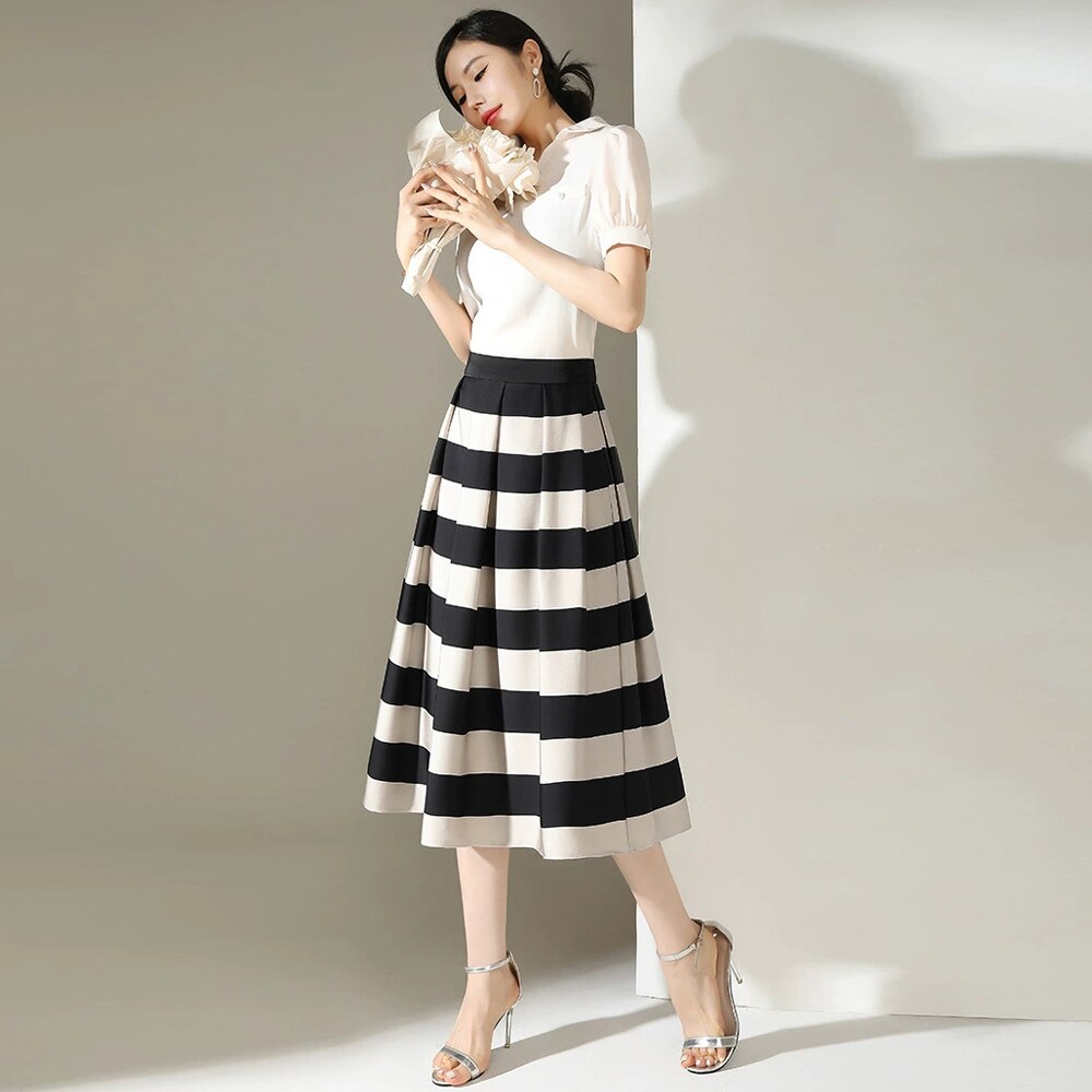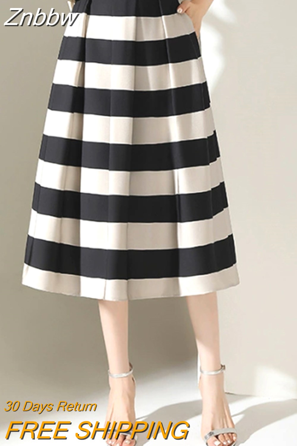 Znbbw Big Black White Striped Baggy High Waist A-Line Skirts For Women Summer Vintage Casual Streetwear Pleated Long Skirts