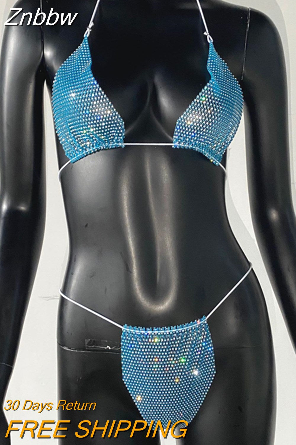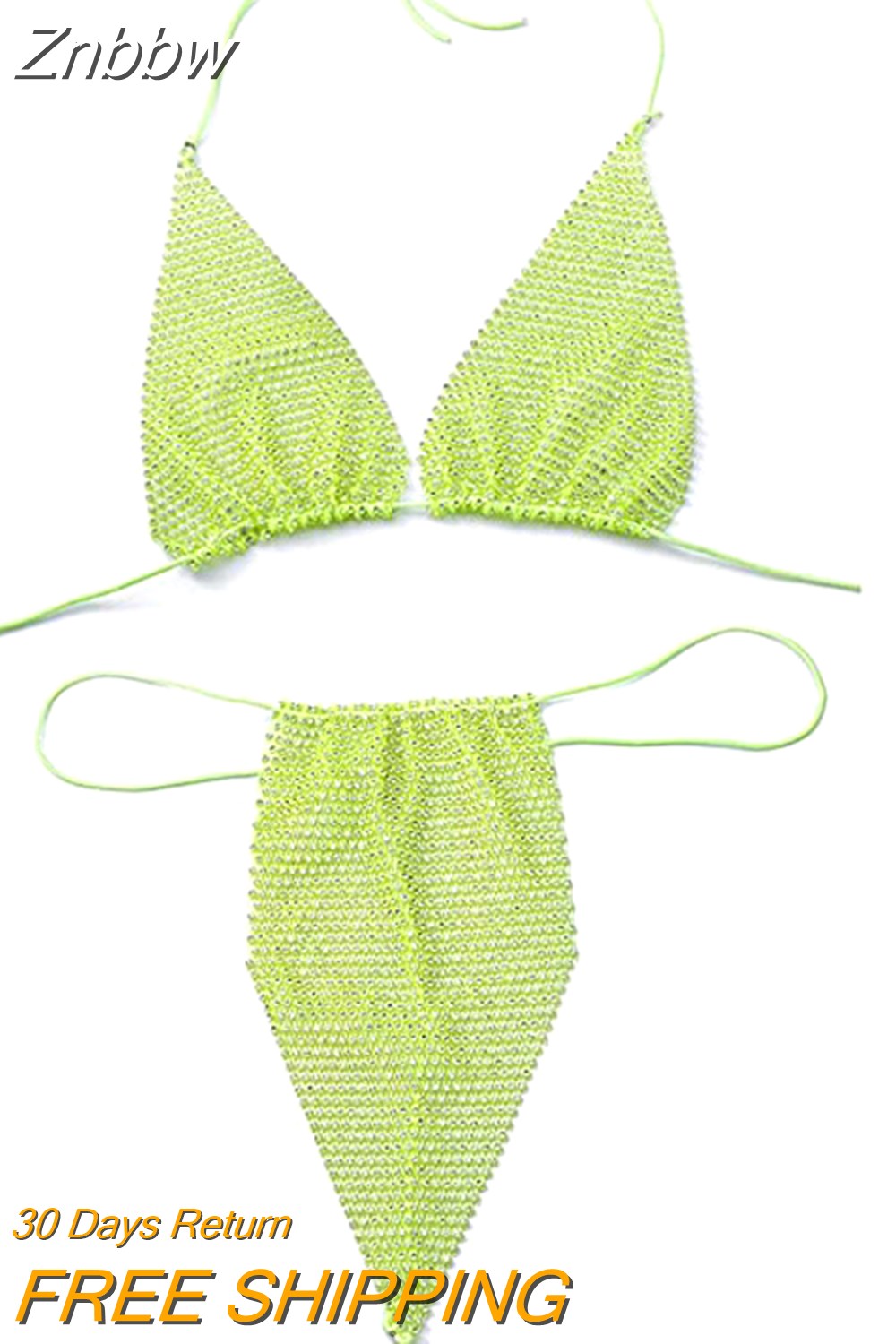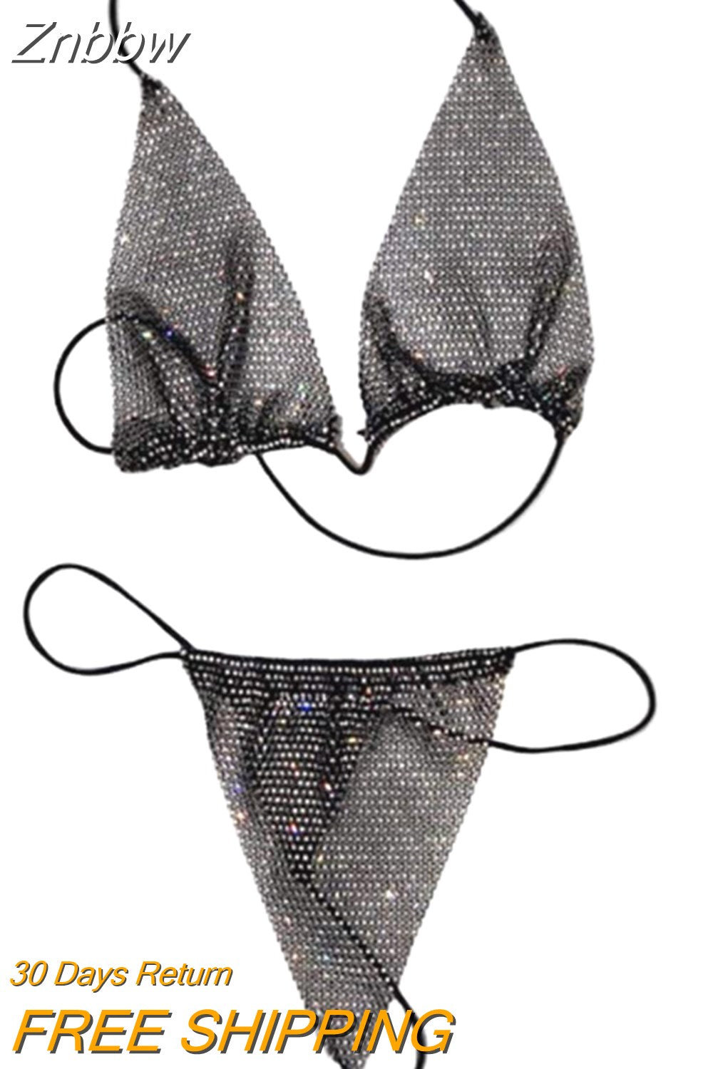 Znbbw Bling Rhinestones Fishnet Bikini Women Halter Bra Sexy Panty 2 Piece Outfits Lady Lingerie Set Sexy Swimwear Women