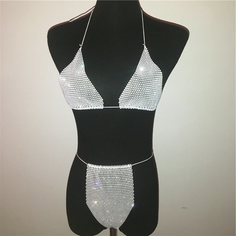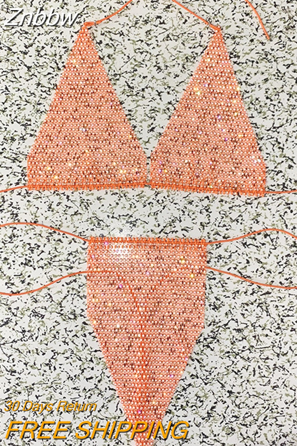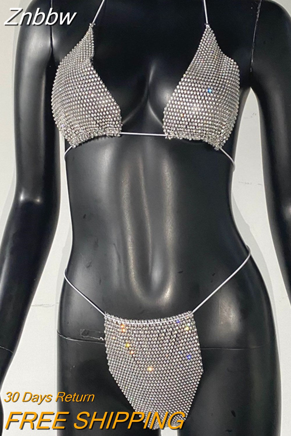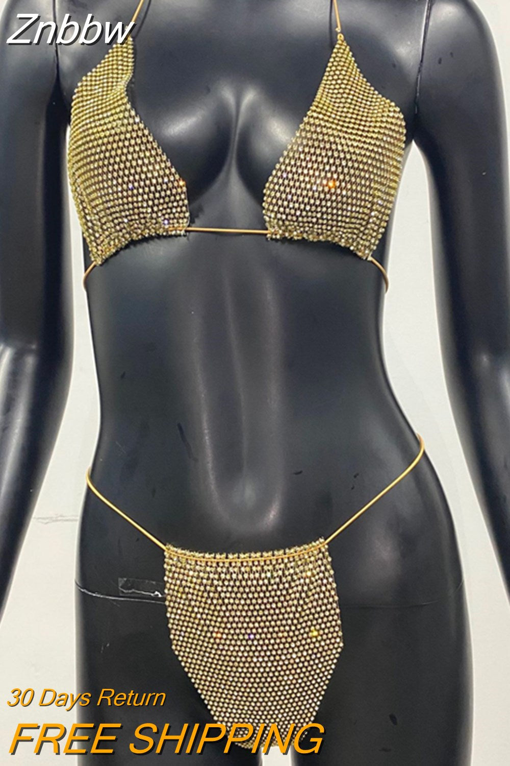 Znbbw Bling Rhinestones Fishnet Bikini Women Halter Bra Sexy Panty 2 Piece Outfits Lady Lingerie Set Sexy Swimwear Women