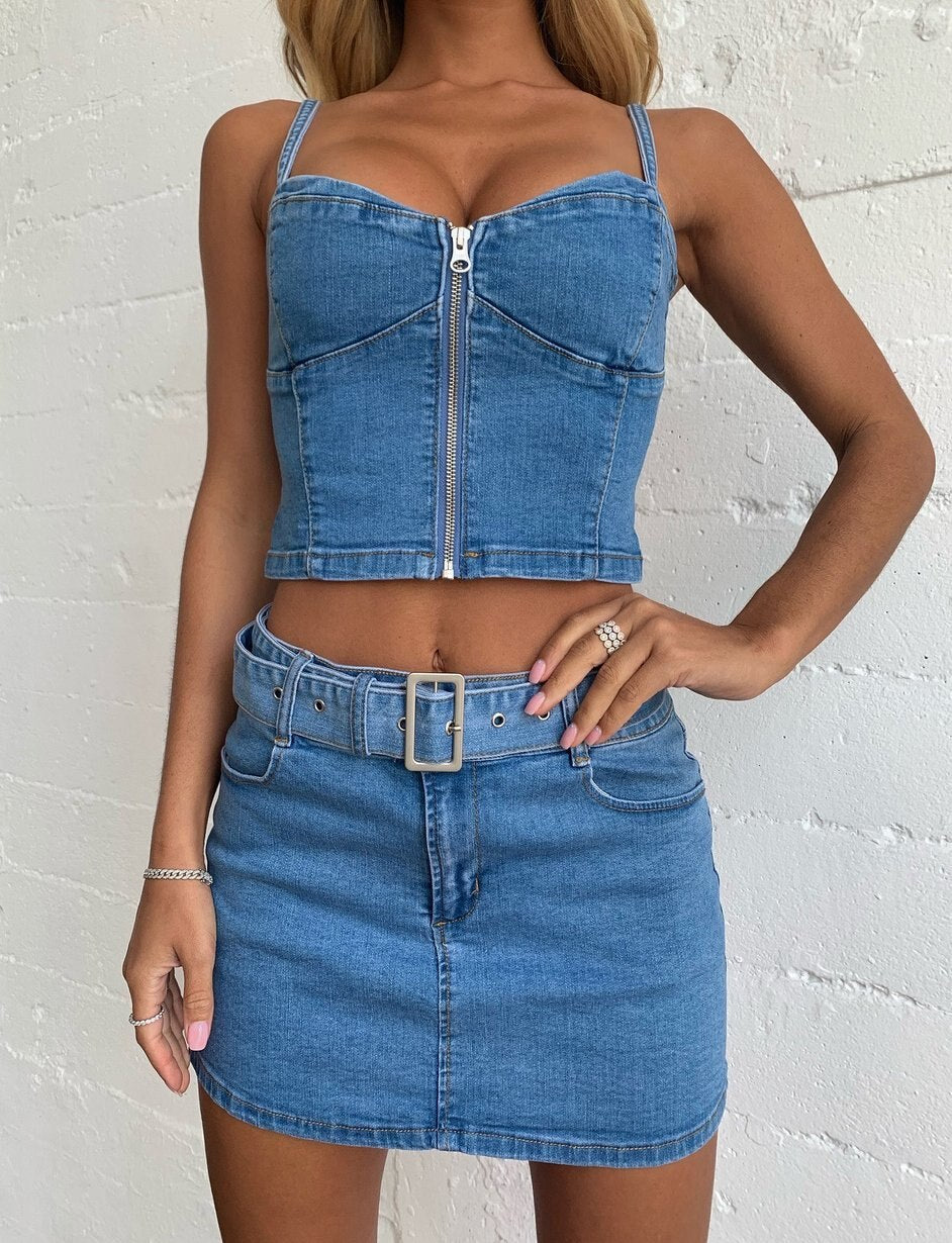 Znbbw Blue Denim Two Pieces Skirts Sets Women Jeans Streetwear Low Cut Straps Bustier Crop Tops+Mini Bodycon Skirts Club Sets
