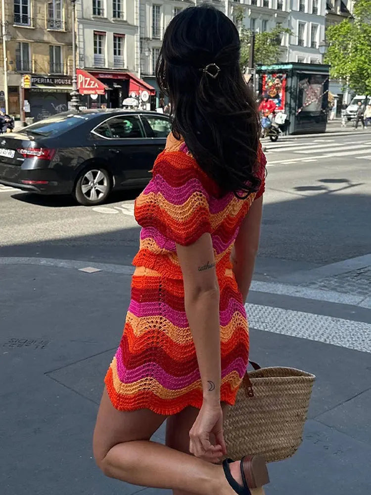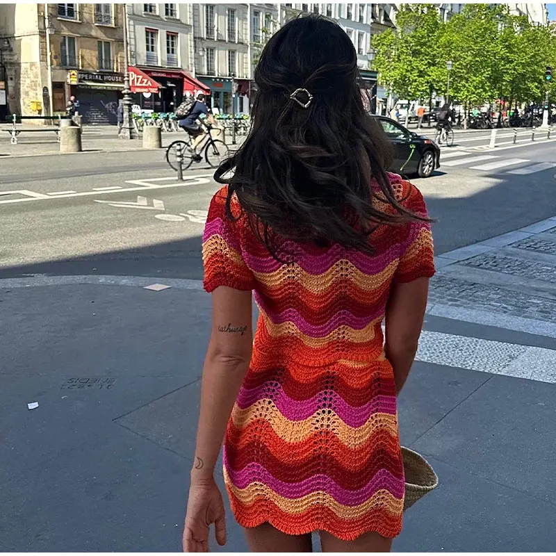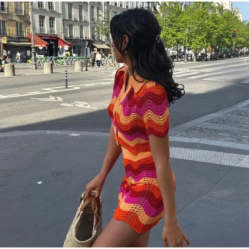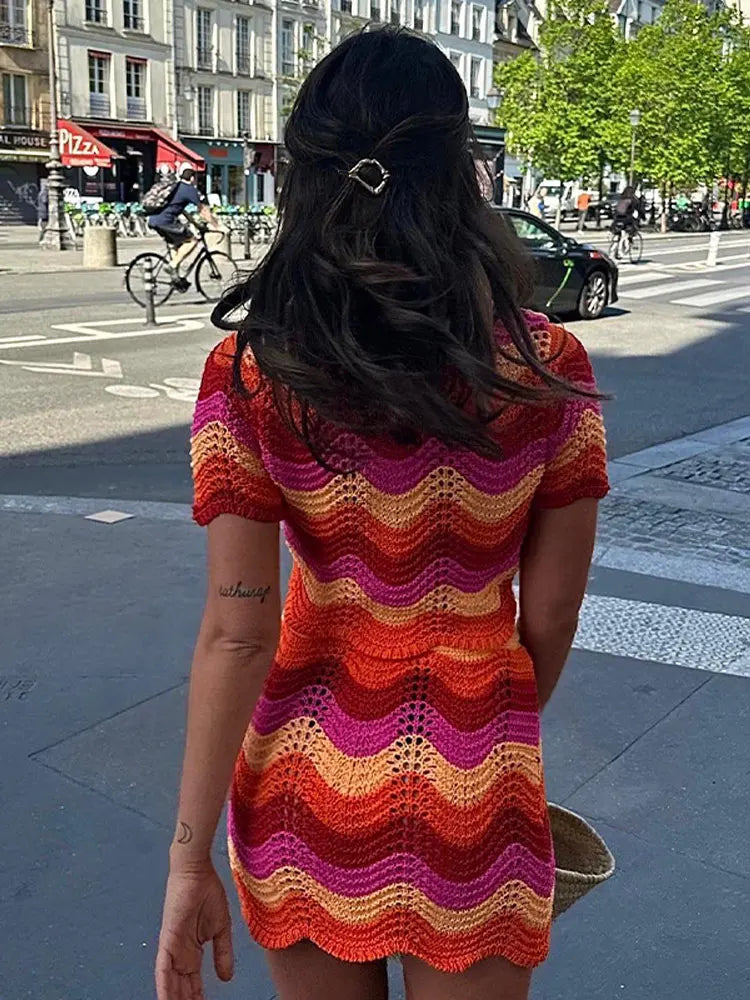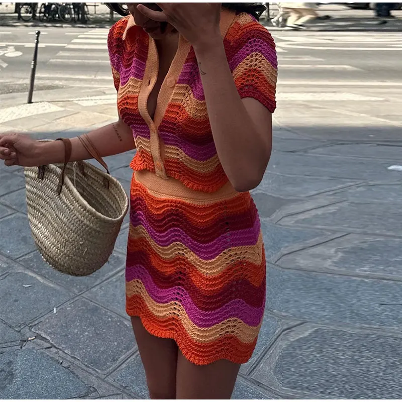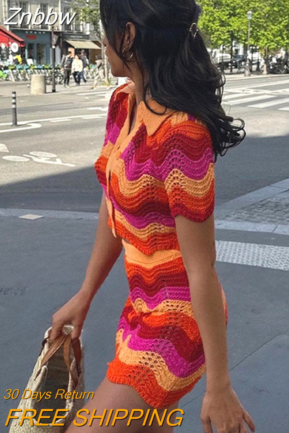 Znbbw Colorful Stripes Knit Skirt Set Women Elegant Lapel Short Sleeve Cardigan Suit New Summer Chic Female Party Streetwear