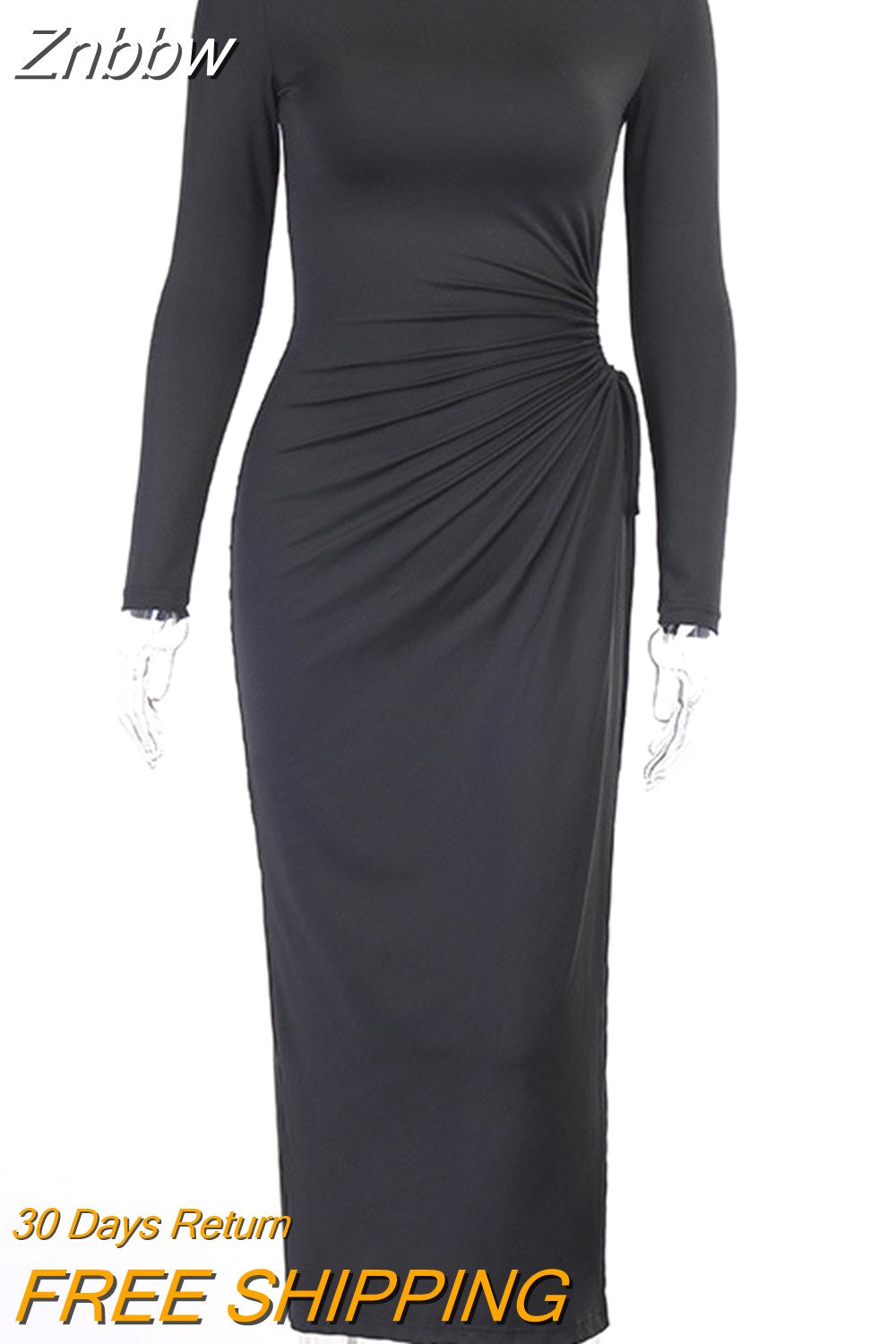 Znbbw Cut Out Drawstring Side Sexy Women Bodycon Split Long Dress Elegant Autumn Long Sleeve Slim Midi Dresses Club Party