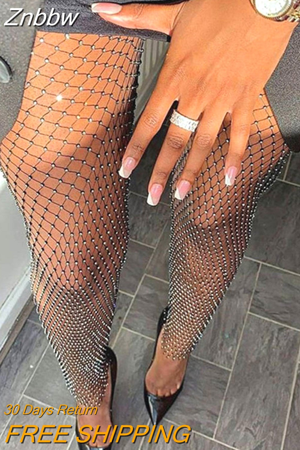 Znbbw Diamond Mesh Pants Women Sexy Summer Hollow Out Transparent Loose Long Fishnet Pants 2023 New BeachWear Trousers