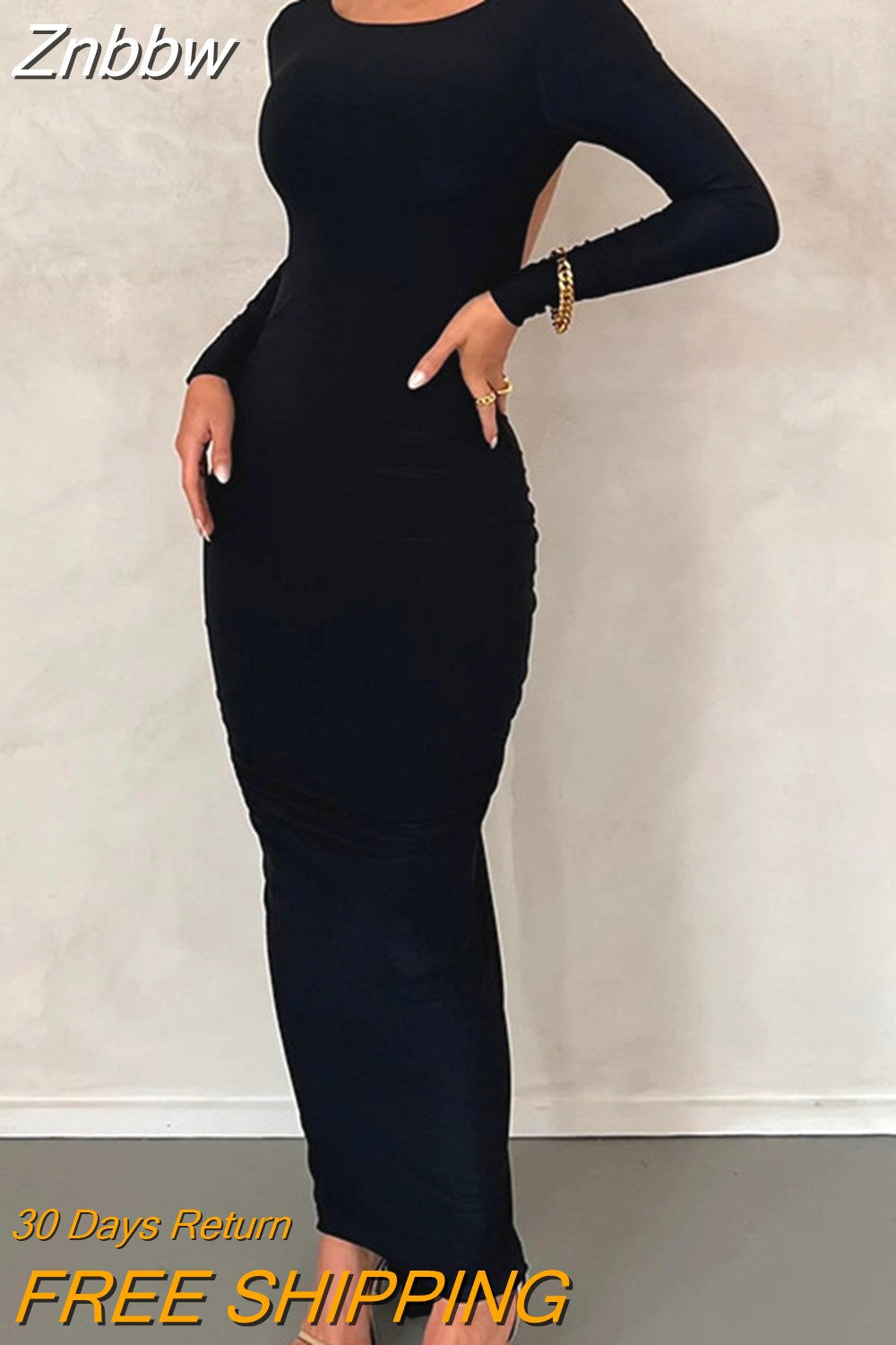 Znbbw Elegant Backless Maxi Dress For Women Robe Autumn Full Sleeve Bodycon High Waist Irregular Ruched Long Dresses Vestido