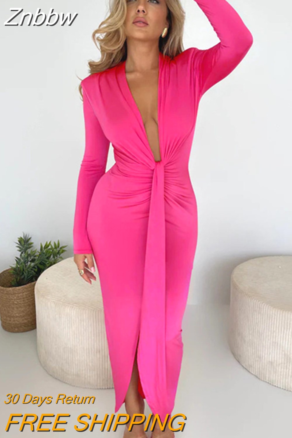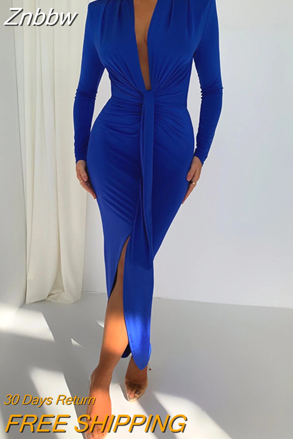 Znbbw Elegant Deep V Neck Full Sleeve Long Dress For Women Robe Fashion Autumn New Irregular Ruched Bodycon Midi Dress
