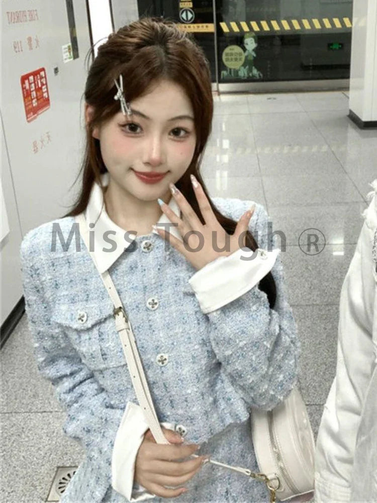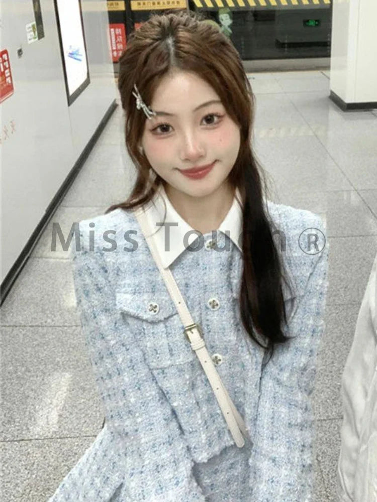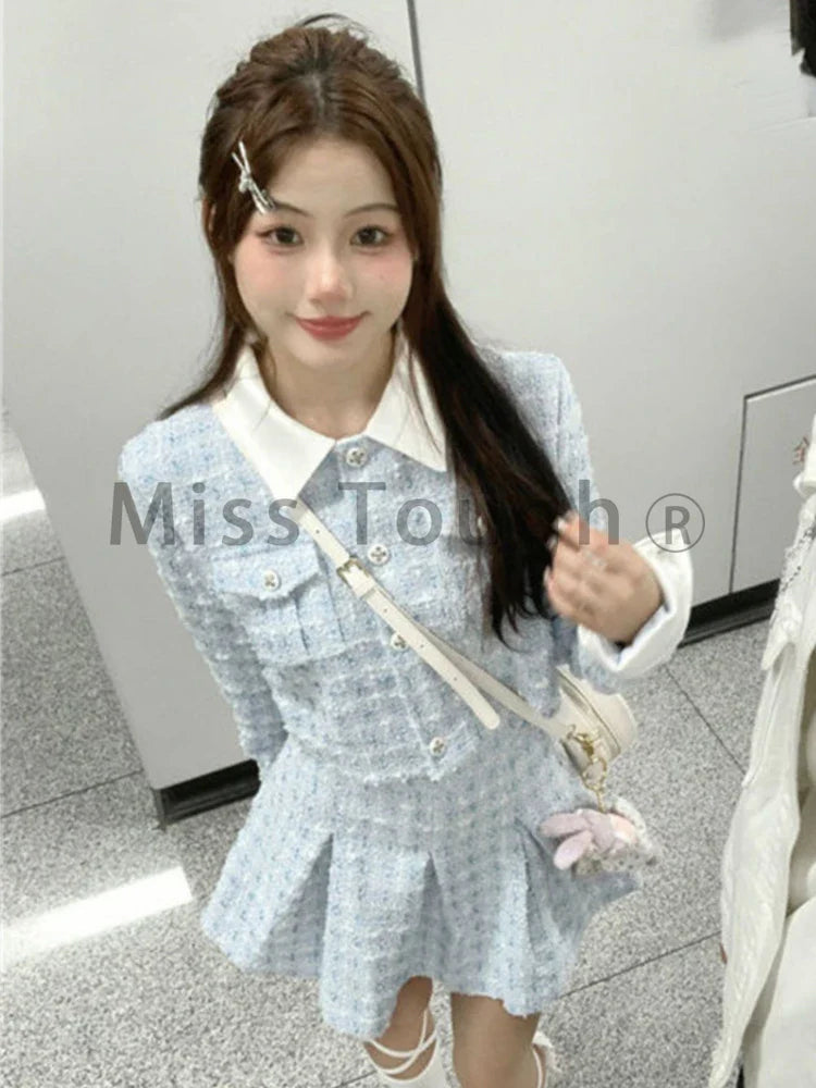 Znbbw Elegant Retro 2 Piece Set Women Blue Pleated Sweet Skirt Suit Female Korean Fashion Long Sleeve Vintage Set 2024 New