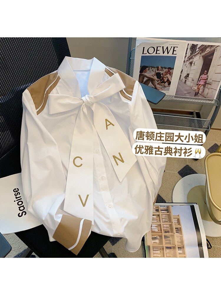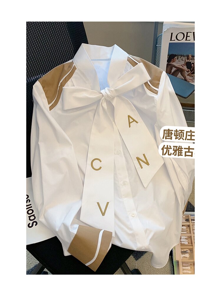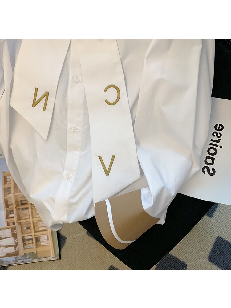 znbbw England Style Long Sleeve Blouses For Women 2023 Bow Letter Tee White Single Breasted V-neck Loose Boyfriend Shirt