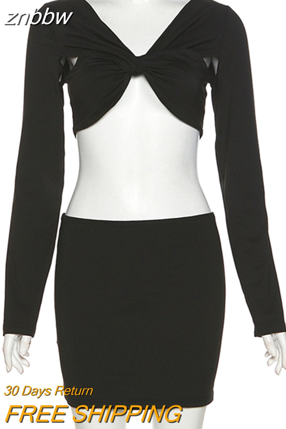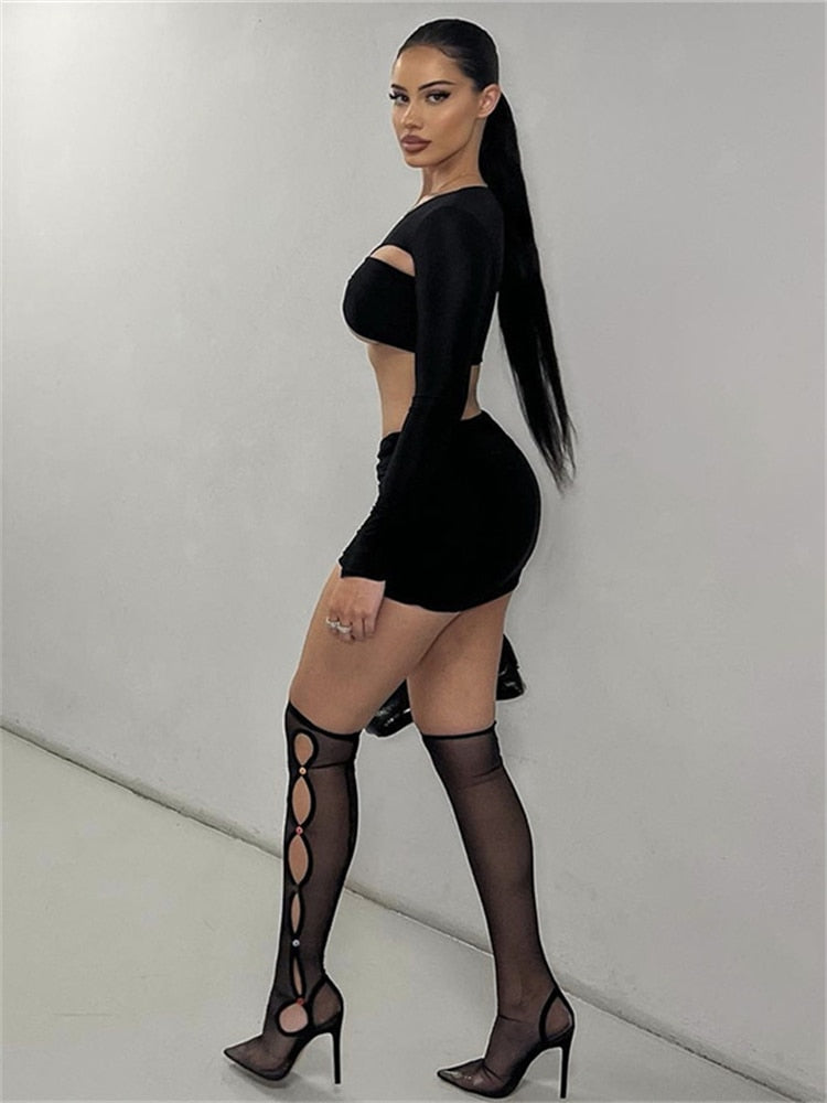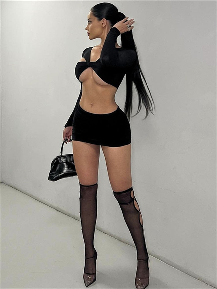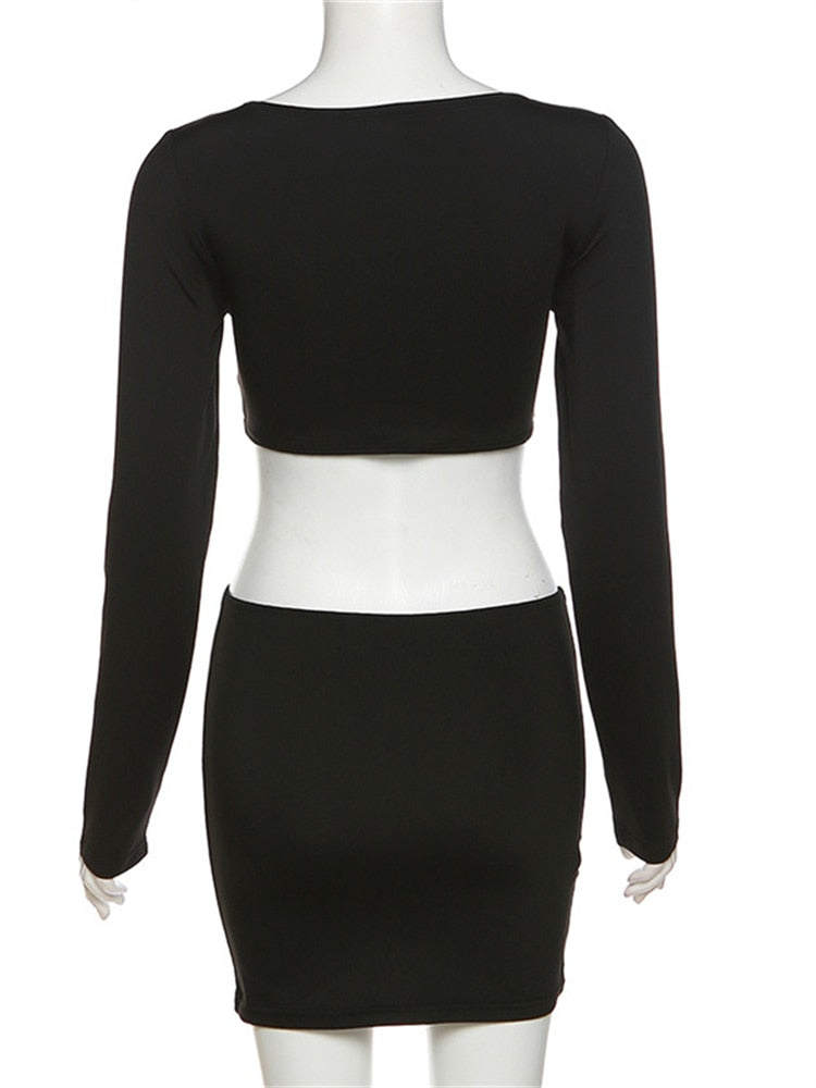 znbbw Fall Sexy Solid Hollow Out 2 Two Piece Sets Club Outfit For Women 2023 Long Sleeve V Neck Crop Top And Skirt Sets Female