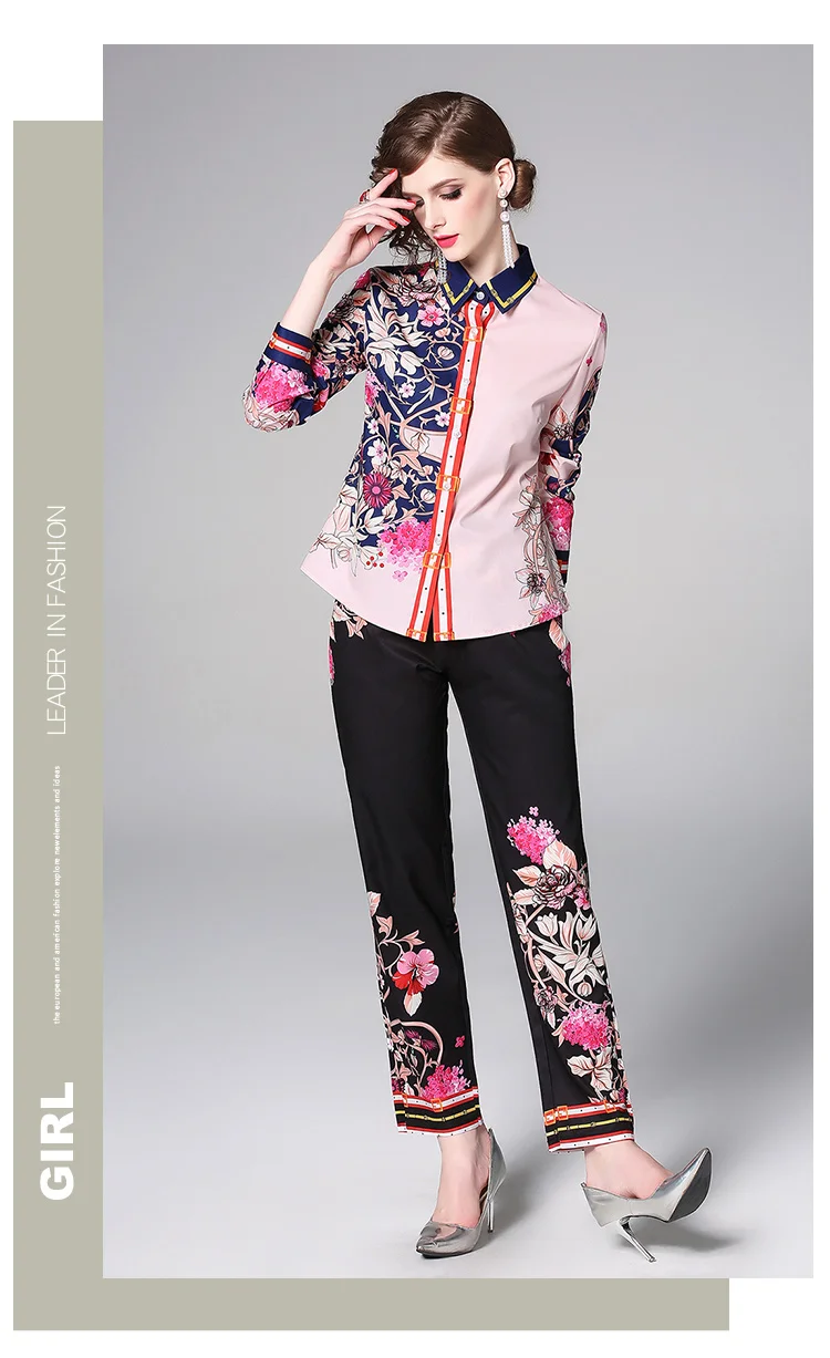 Znbbw Fashion Designer Runway Suit Sets 2023 Spring Long Sleeve Floral Bow Print Tops + Long Pants 2 Piece Set Women B7586