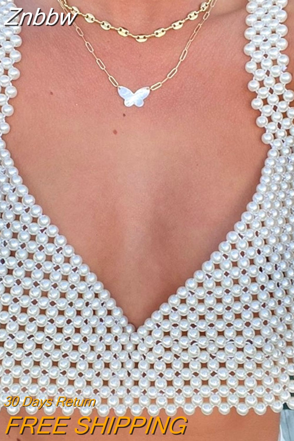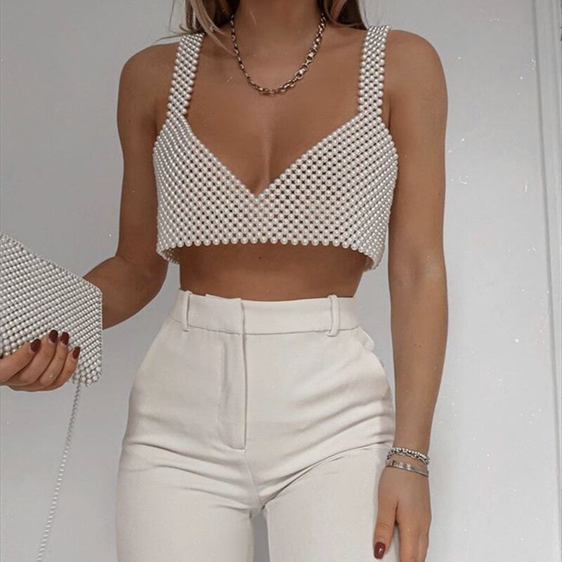 Znbbw Fashion Elegant Sexy Hollow Pearl Camisole Women V Neck Solid Color Sleeveless Tank Top Streetwear Summer Casual Crop Top