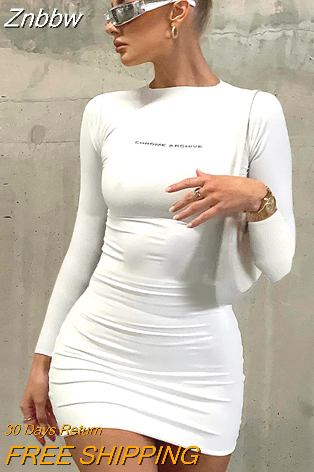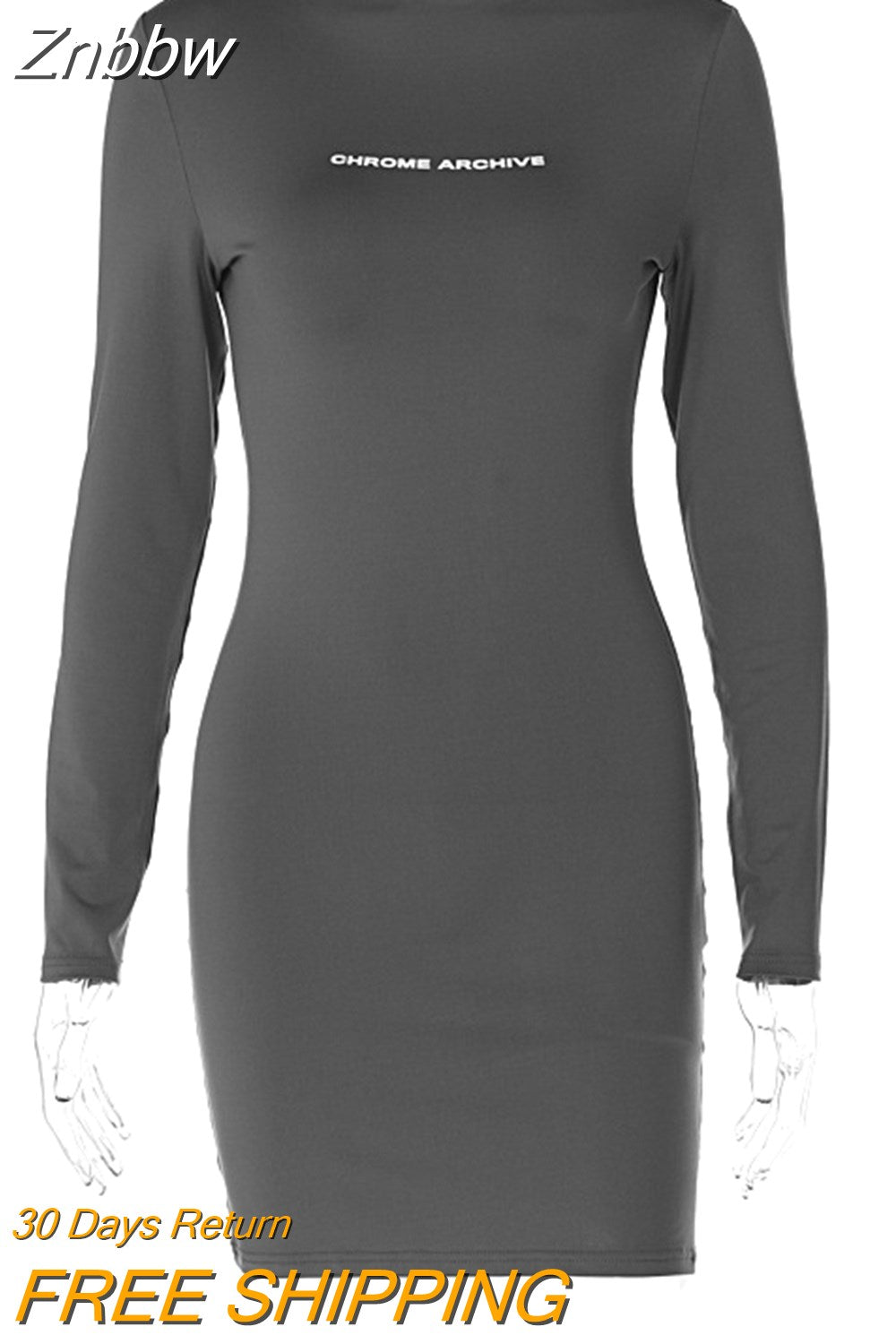 Znbbw Fashion Letter Print Bodycon Mini Dress For Women 2023 Autumn O Neck Full Sleeve Casual Short Dresses Vestido