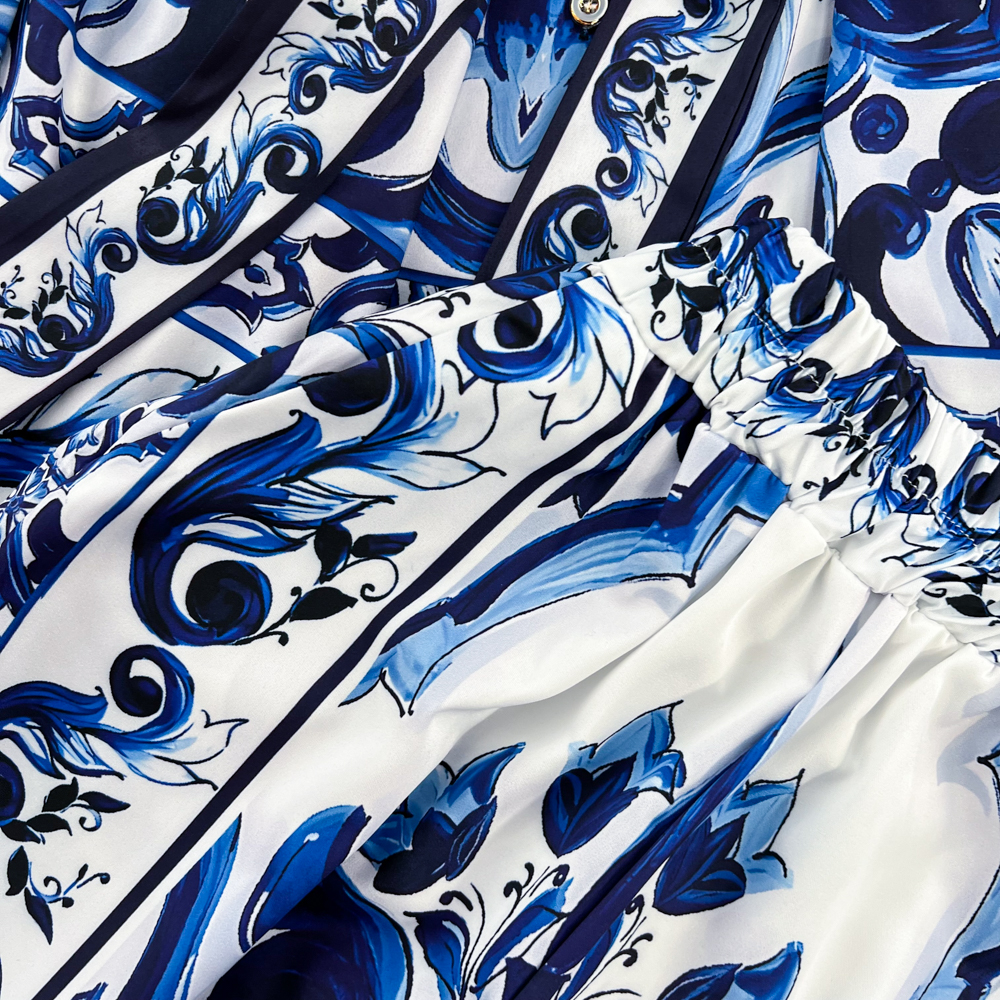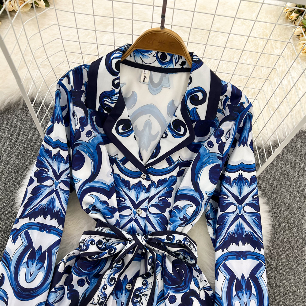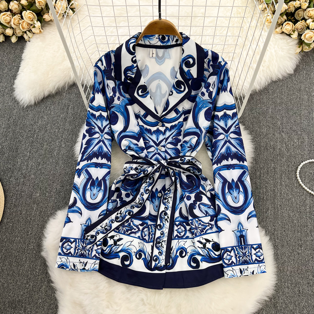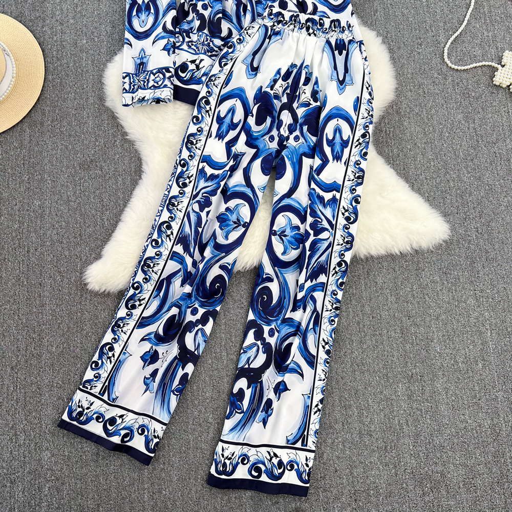 Znbbw Fashion Runway 2 Piece Pants Set Women Long Sleeve Vintage Porcelain Print Belt Blouse and Wide Leg Trousers Suits Outfit
