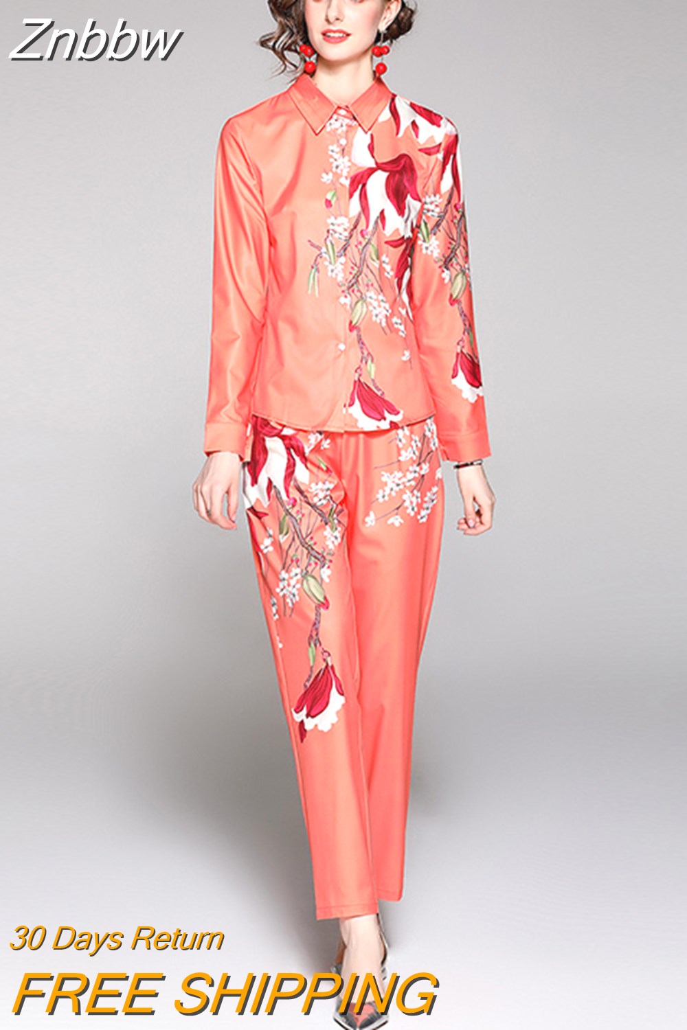Znbbw Fashion Runway Suit for Women Elegant Long Sleeve Floral Print Shirt and Pants 2 Piece Matching Set Office Outfits N68995