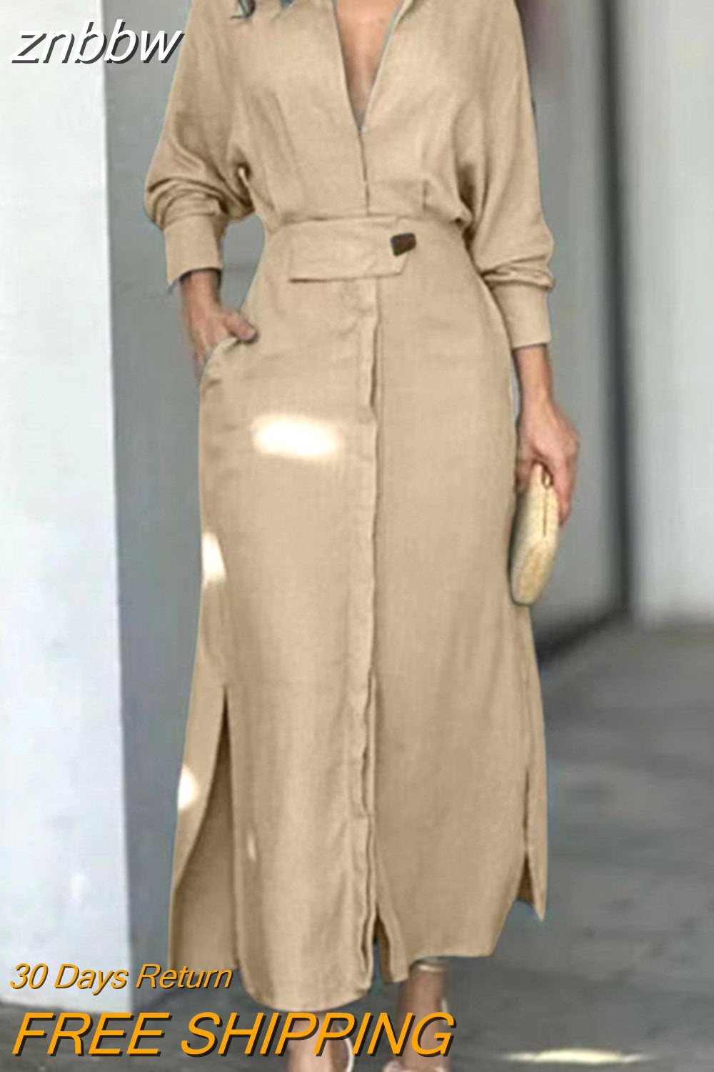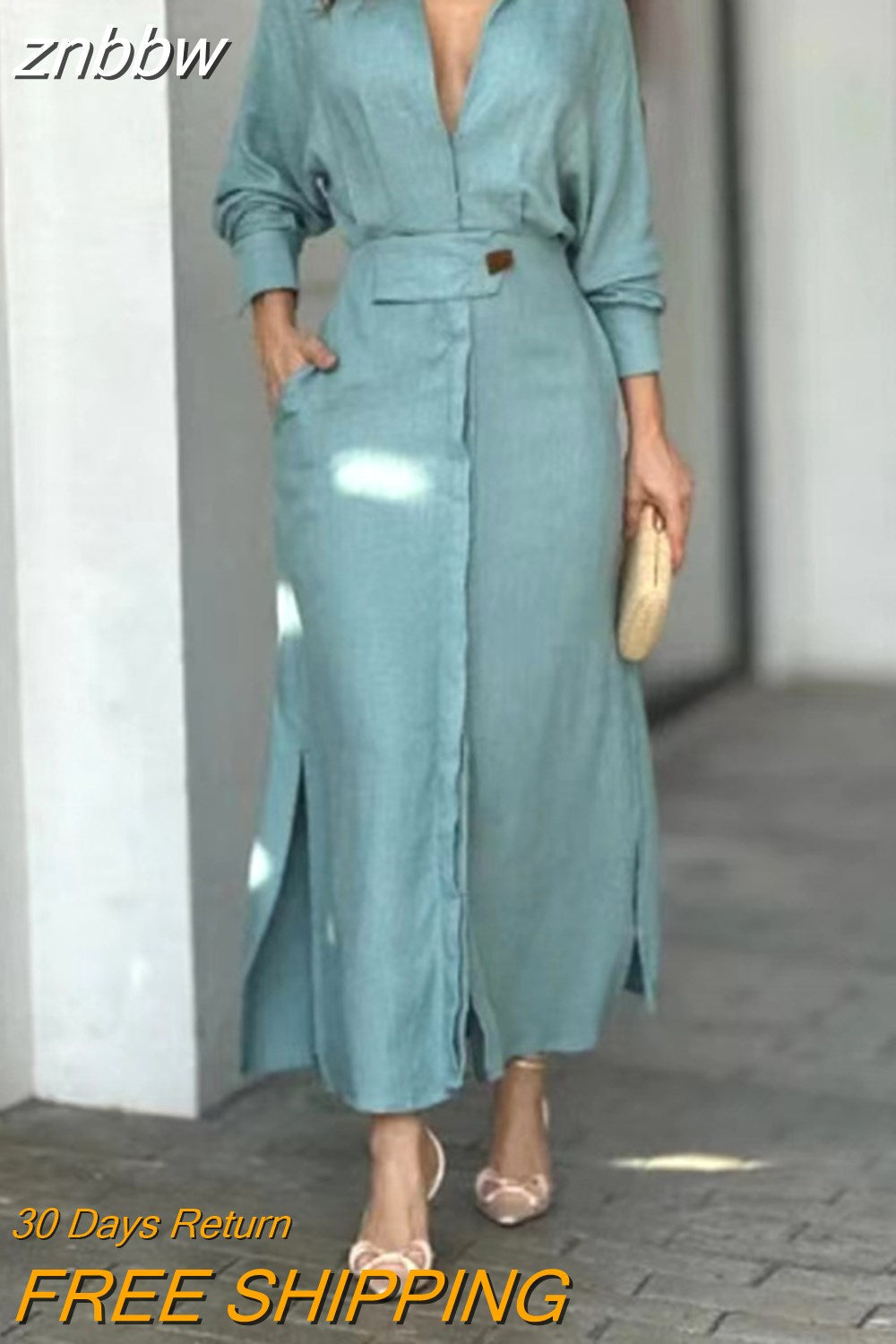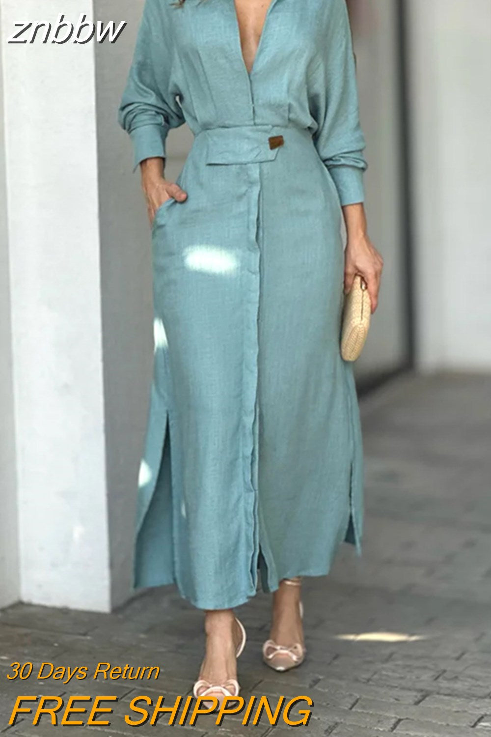 znbbw Fashion Slit Solid Shirt Dress Women Casual V Neck Lapel Full Sleeve With Pockets Long Skirt Spring Lady Streetwear Dresses