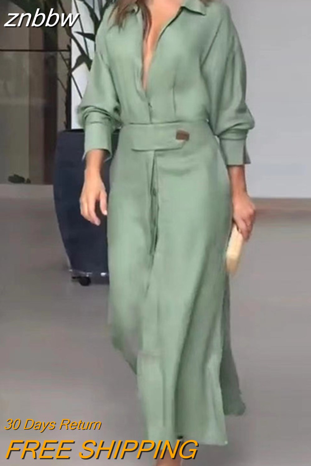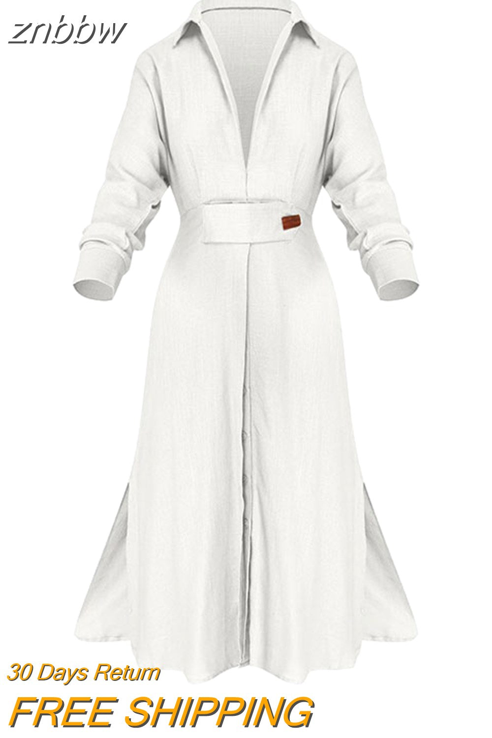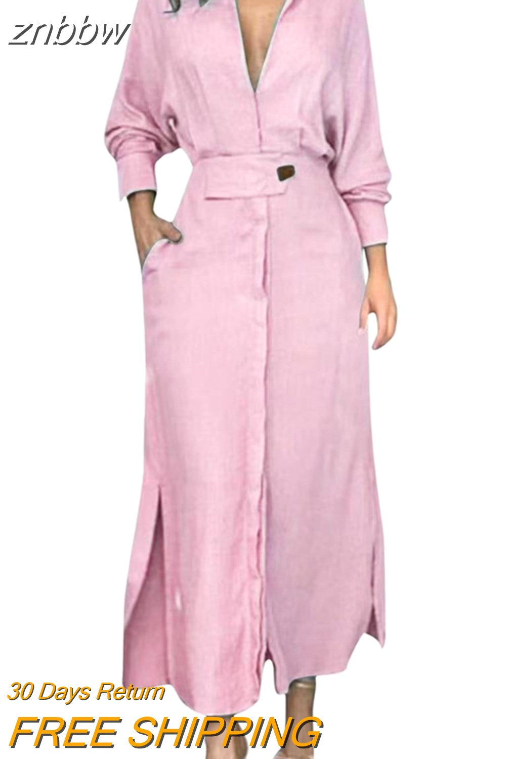 znbbw Fashion Slit Solid Shirt Dress Women Casual V Neck Lapel Full Sleeve With Pockets Long Skirt Spring Lady Streetwear Dresses