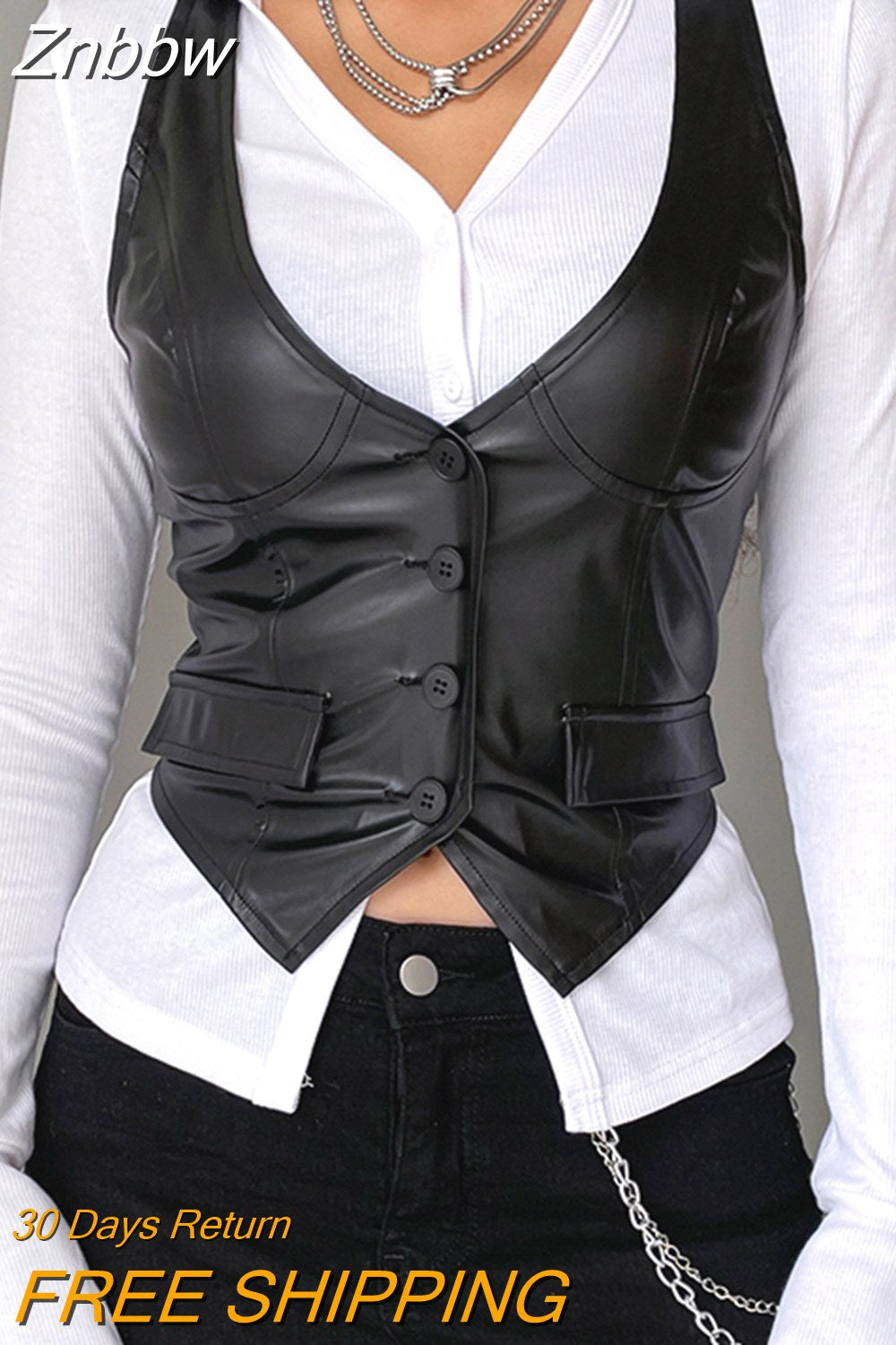 Znbbw Fashion Vintage Sexy PU Leather Vest Women Sleeveless Button Closure Design Slim Fit Tank Tops Streetwear Crop Top