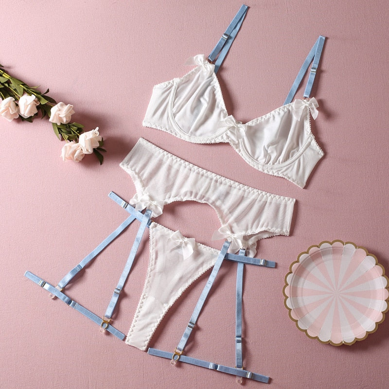 Znbbw Female Lingerie Fairy Garter Belt Set Bowknot Patchwork Transparent Mesh Intimate Erotic Bra And Panty Set Exotic Sets