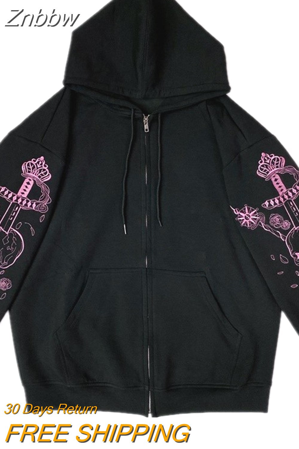 Znbbw Gothic Butterfly Print Oversize Zip Up Hoodies 2023 Winter New Grunge Long Sleeve Sweatshirt Casual Hooded Jacket Streetwear