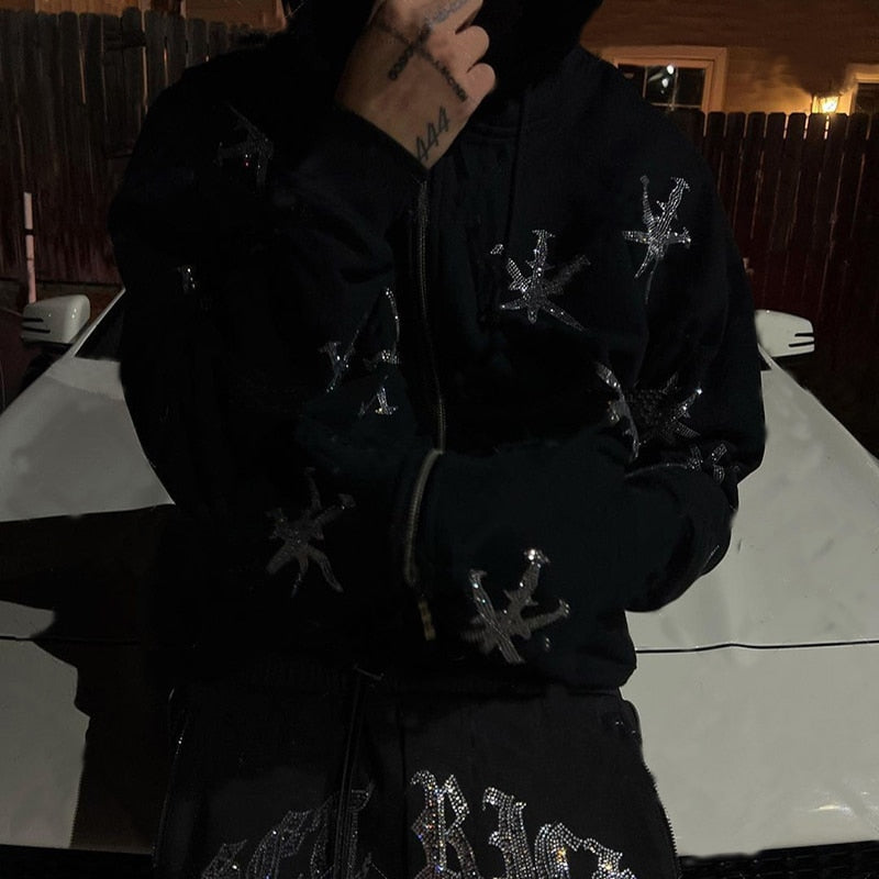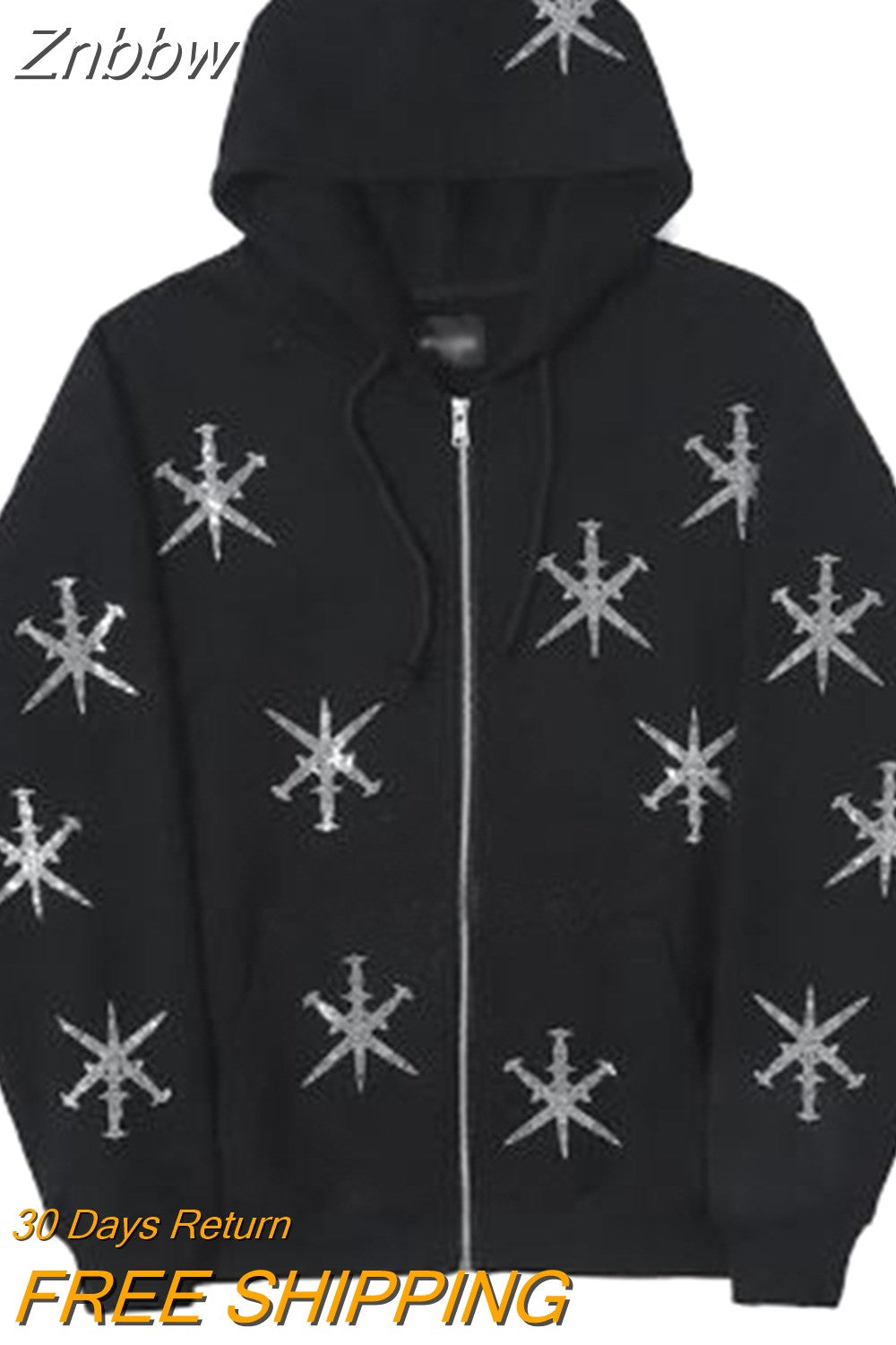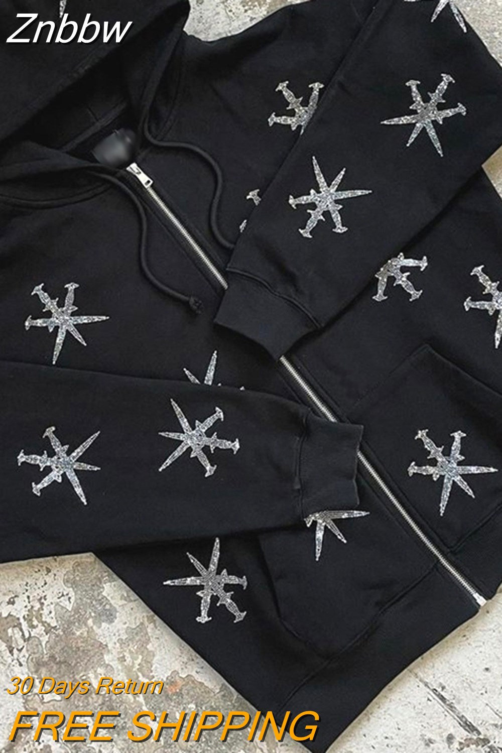Znbbw Gothic Y2K Rhinestone Graphic Jacket Zip Up Hoodies Korean Streetwear Grunge Hip Hop Long Sleeve Fashion Sweatshirt Coat