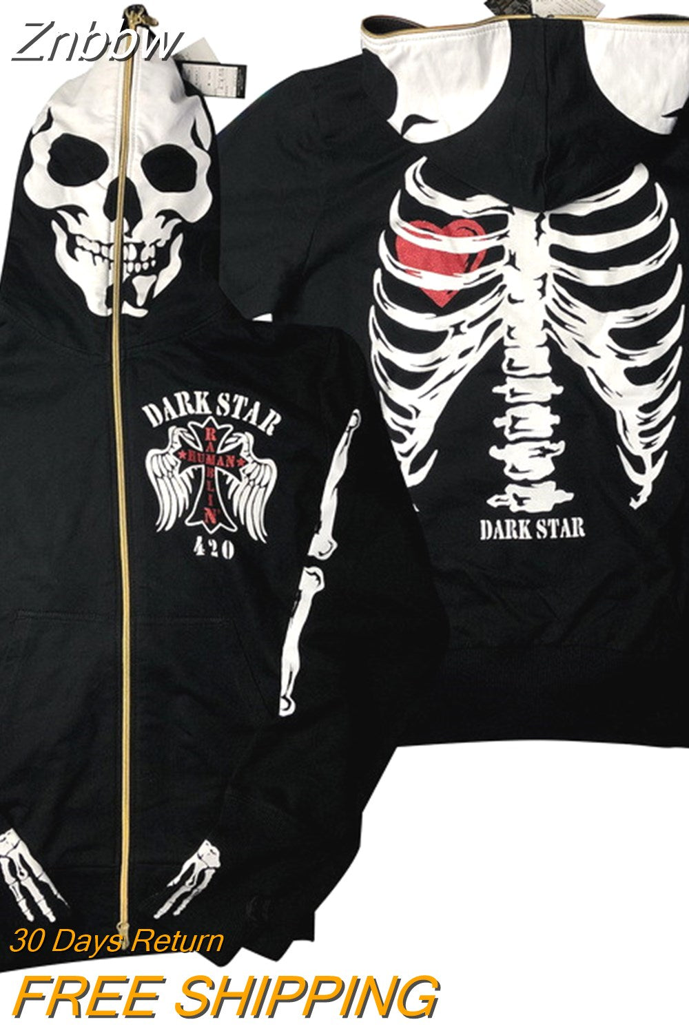 Znbbw Gothic Zipper Oversized Hoodies Retro Skull Print Streetwear Sweatshirt Women Winter Hip Hop Graffiti Unisex Zip Jacket Coat