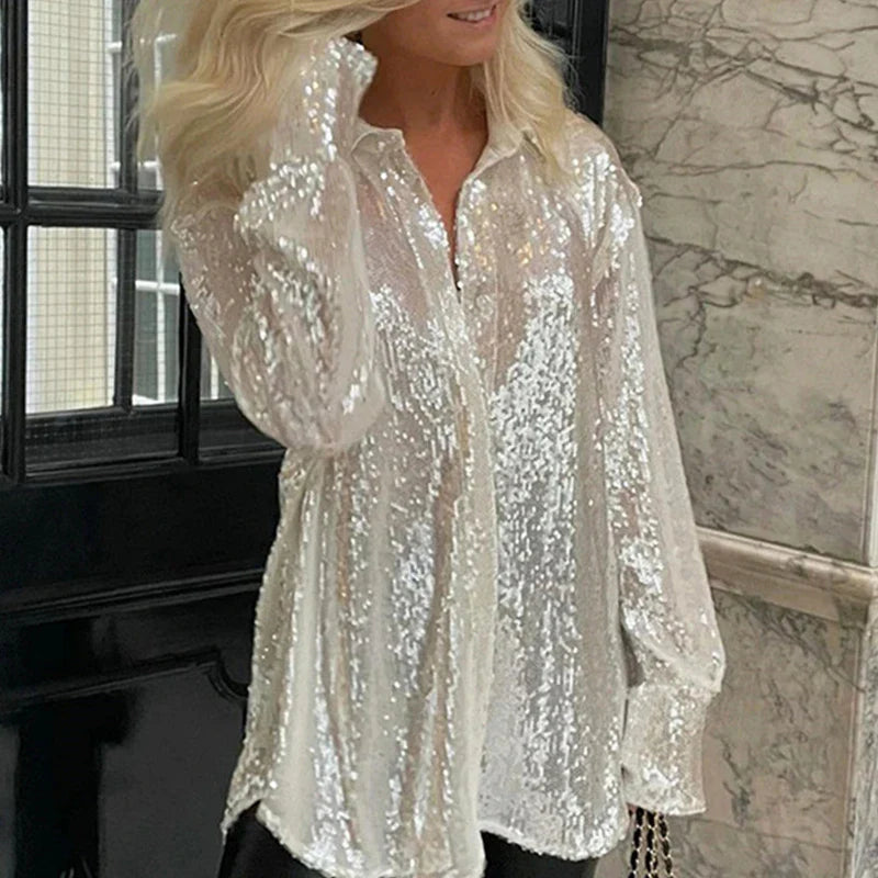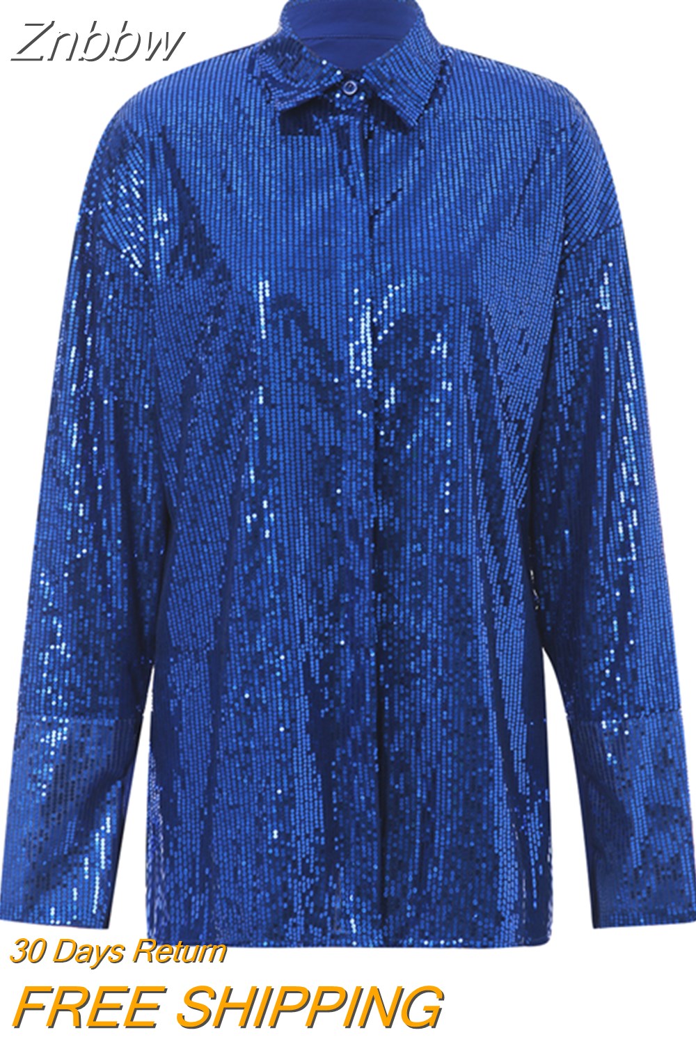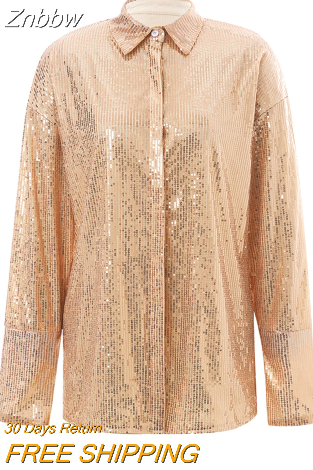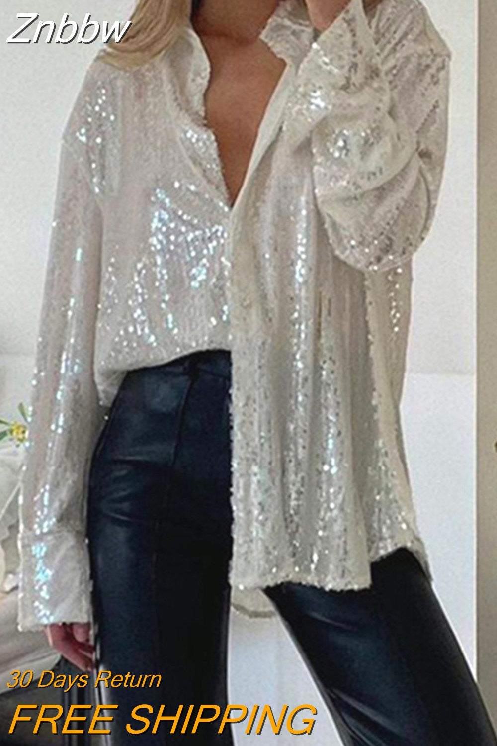Znbbw Grunge Party Blouse Summer Fall Long Sleeve Button Down Lapel Neck Shirt Sequins Patchwork Glitter Tops Female Streetwear
