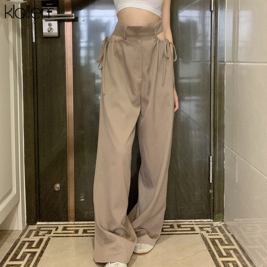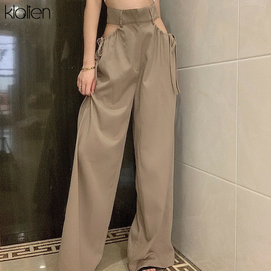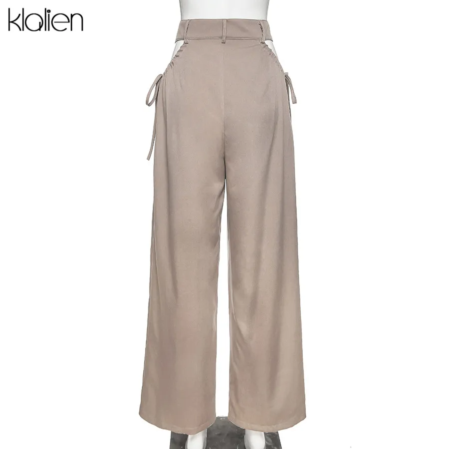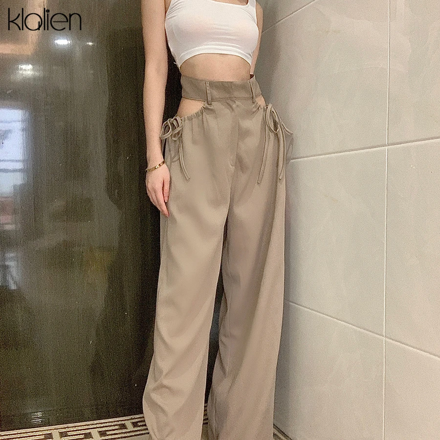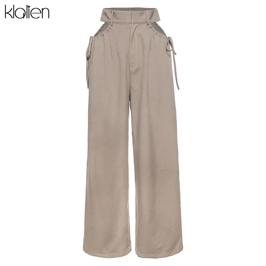 Znbbw high street casual female wide leg pant sexy hollow out bandage zipper high waiste solid wild loose trousers spring new