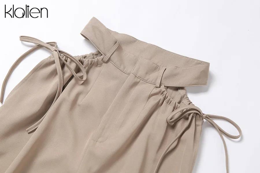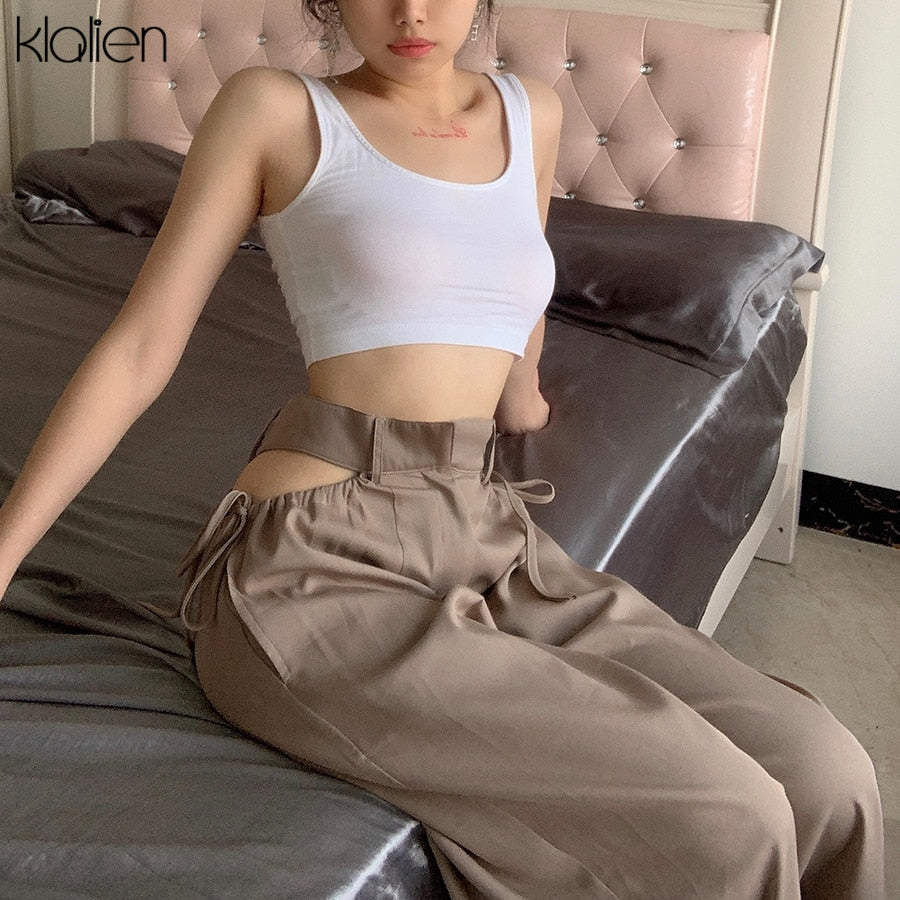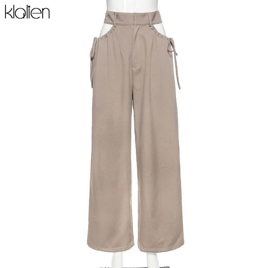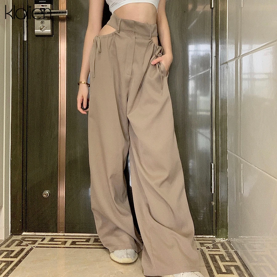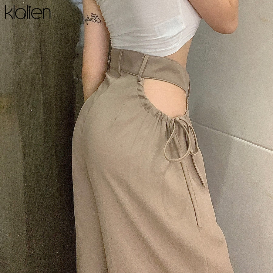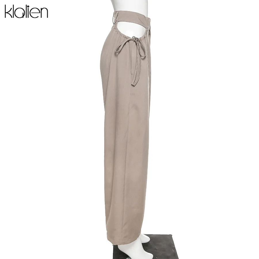 Znbbw high street casual female wide leg pant sexy hollow out bandage zipper high waiste solid wild loose trousers spring new