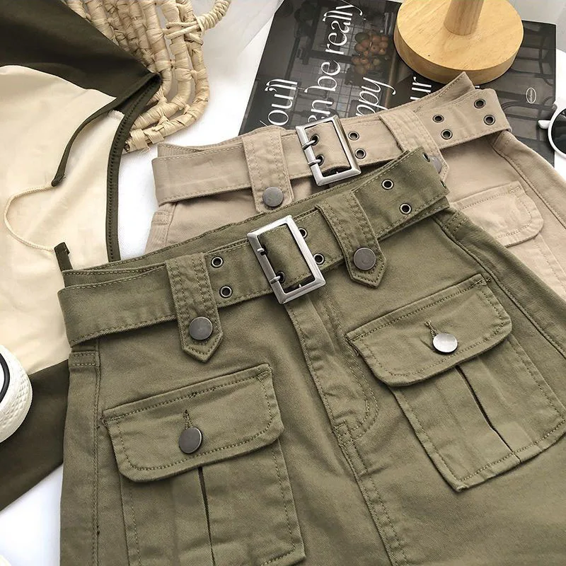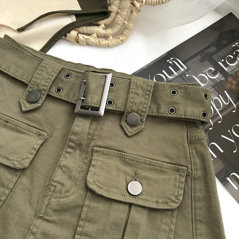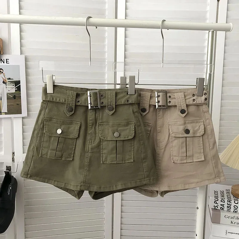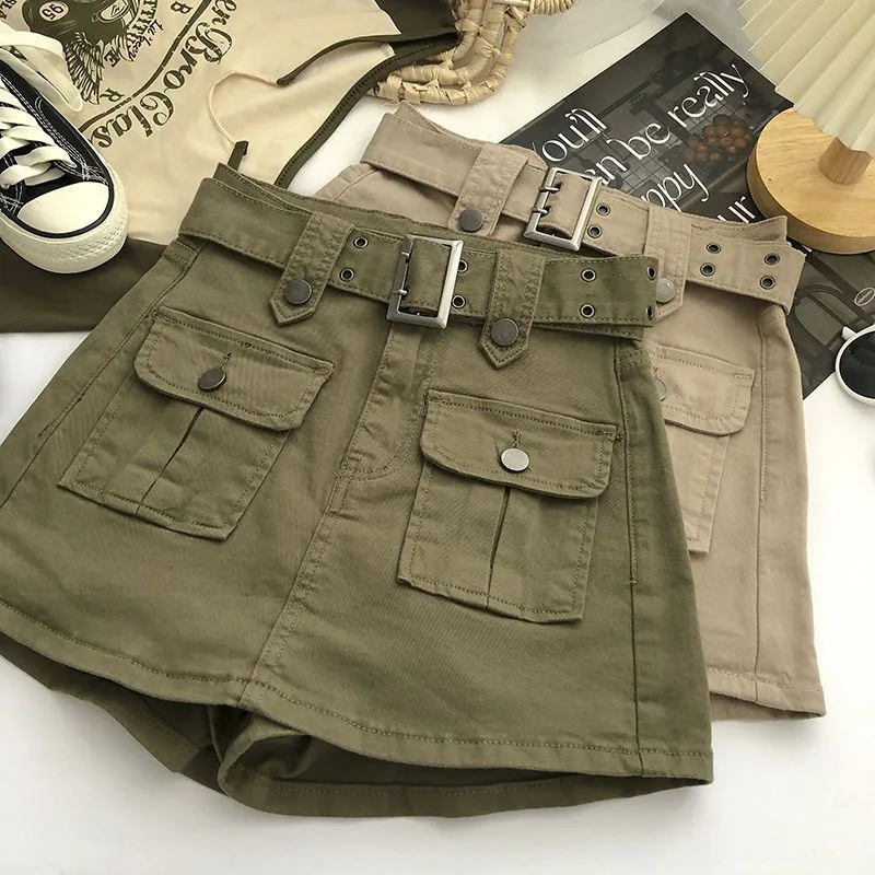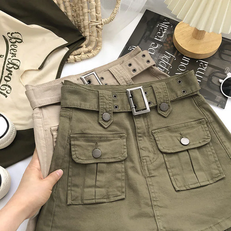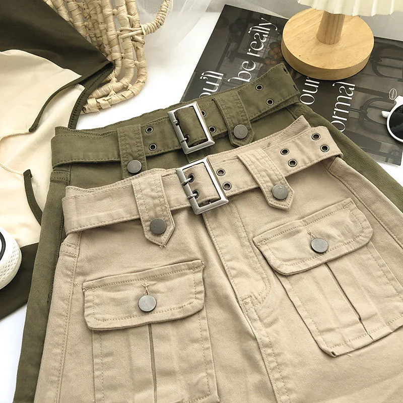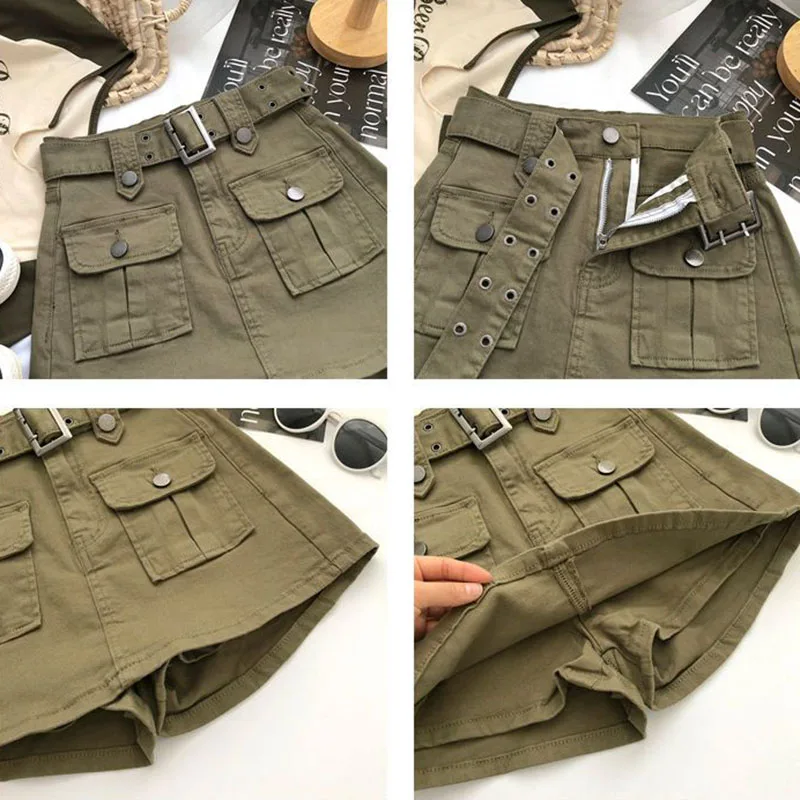 Znbbw High Waist Cargo Skirts Women Fashion Korean Chic with Belt Short Culotte Skirts Female Pocket Streetwear Jean Mini Skirts