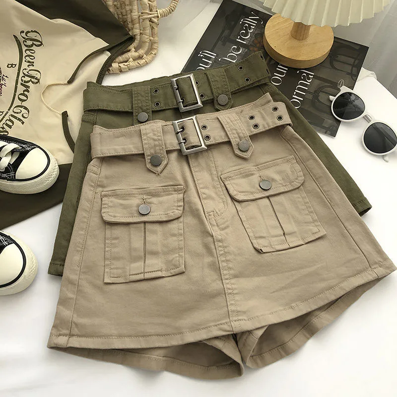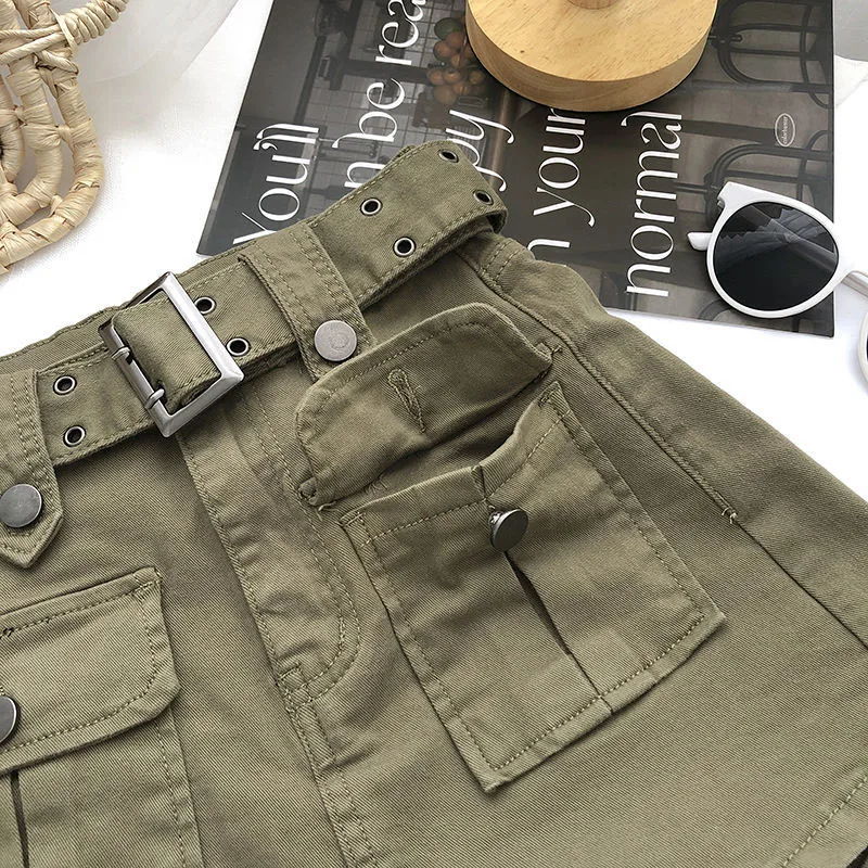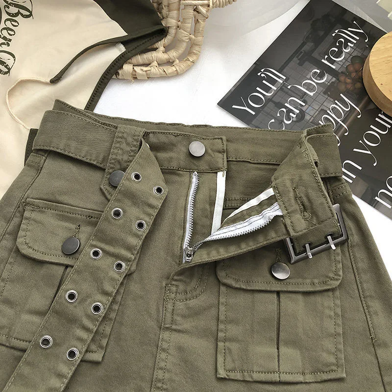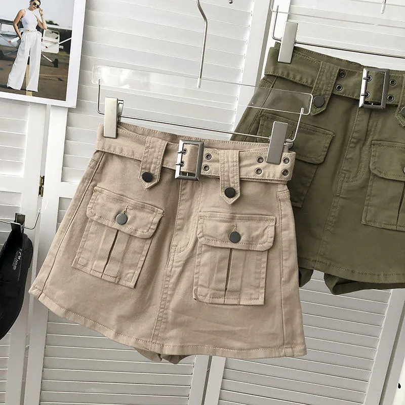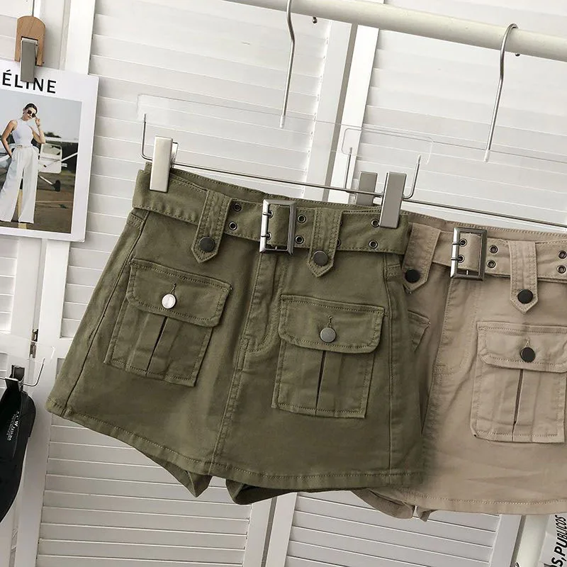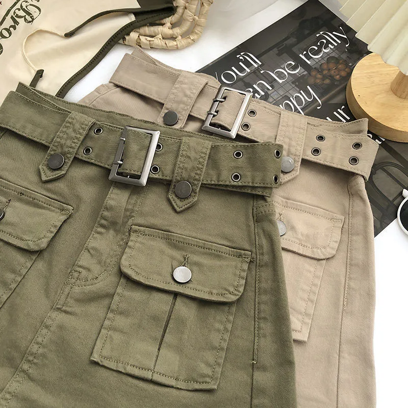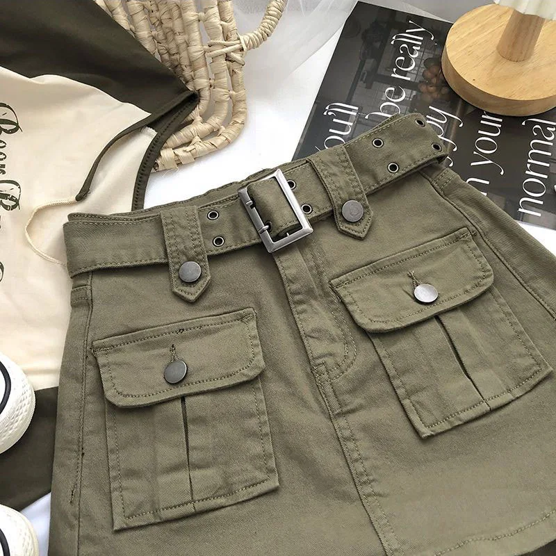 Znbbw High Waist Cargo Skirts Women Fashion Korean Chic with Belt Short Culotte Skirts Female Pocket Streetwear Jean Mini Skirts