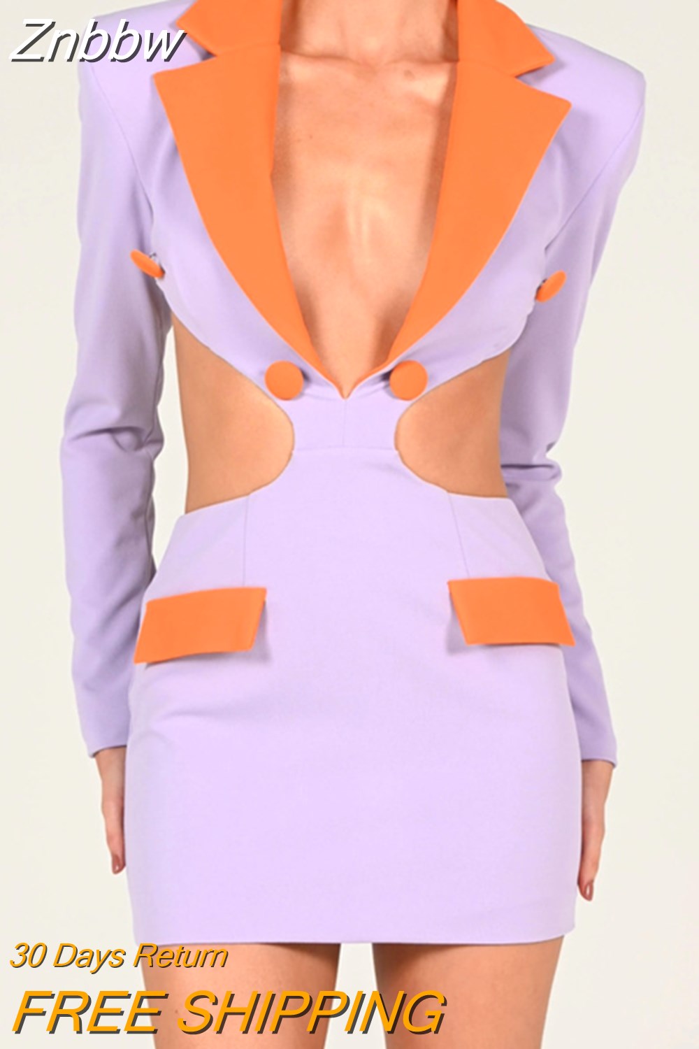 Znbbw Hollow Out Backless Blazer Dress For Women Robe Autumn Notched Collar Full Sleeve Bodycon Party Mini Dress Vestido