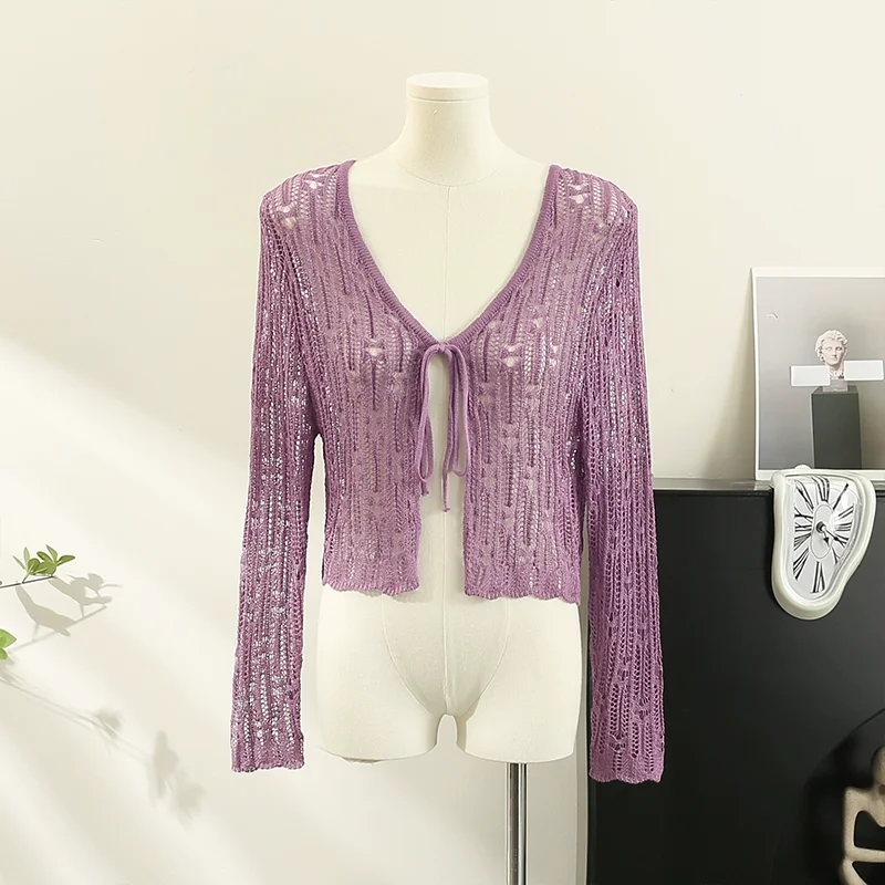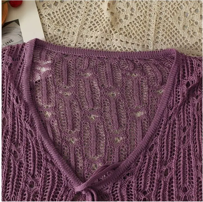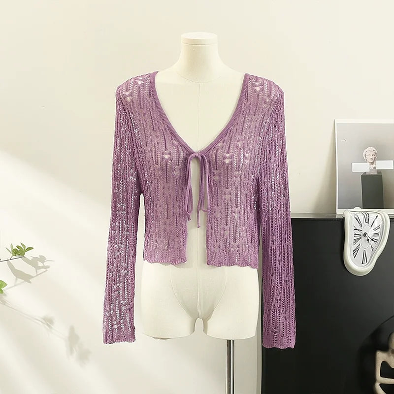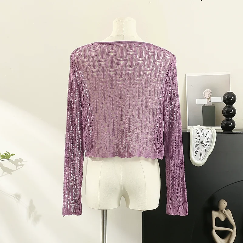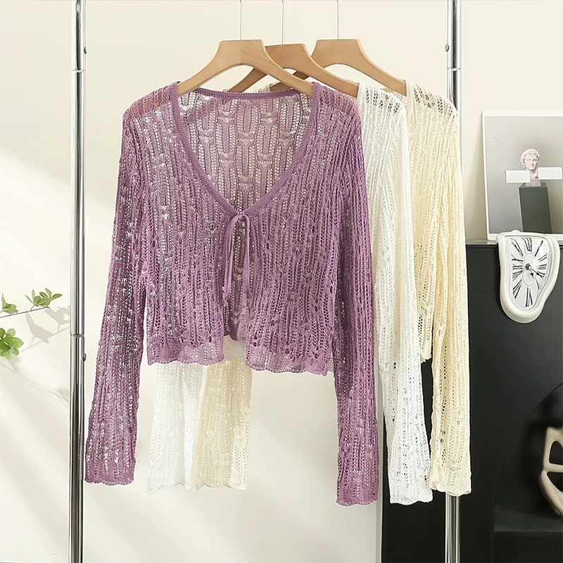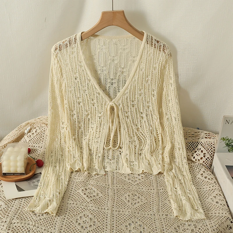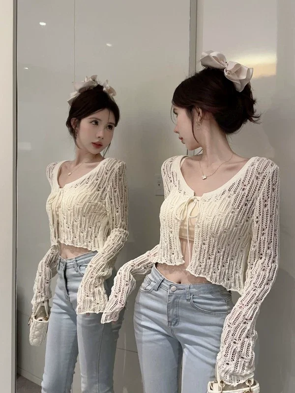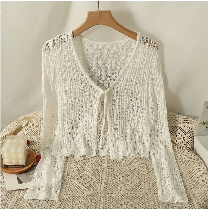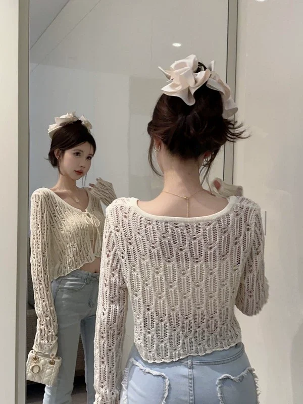 Znbbw Hollow Out Sweater Shirts Lady Summer Full Sleeve Laced Crocheting Cardigan Thin Short Coats for Slim Woman