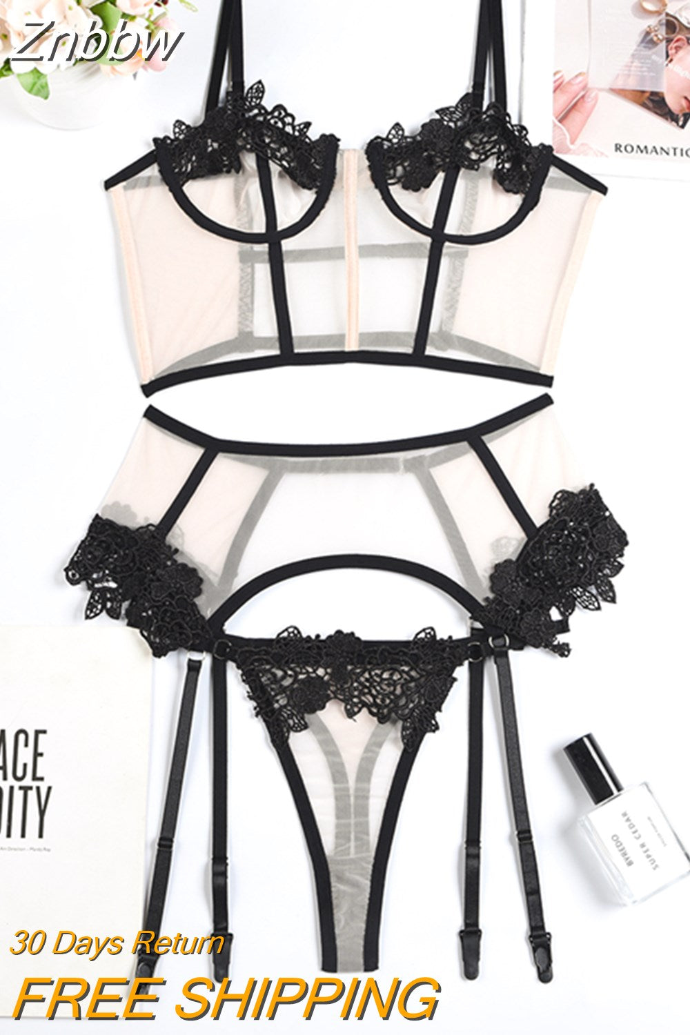 Znbbw Lingerie Sexy Thong Panties Female Underwear Sets Patchwork Lace 3-Piece Transparent Bra Erotic Costumes Nude Outfits
