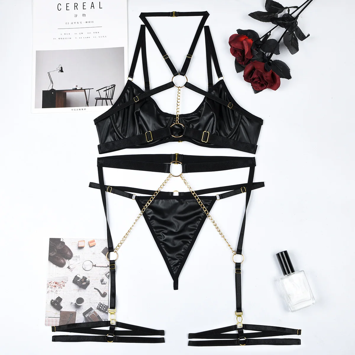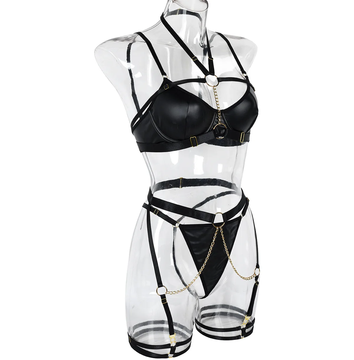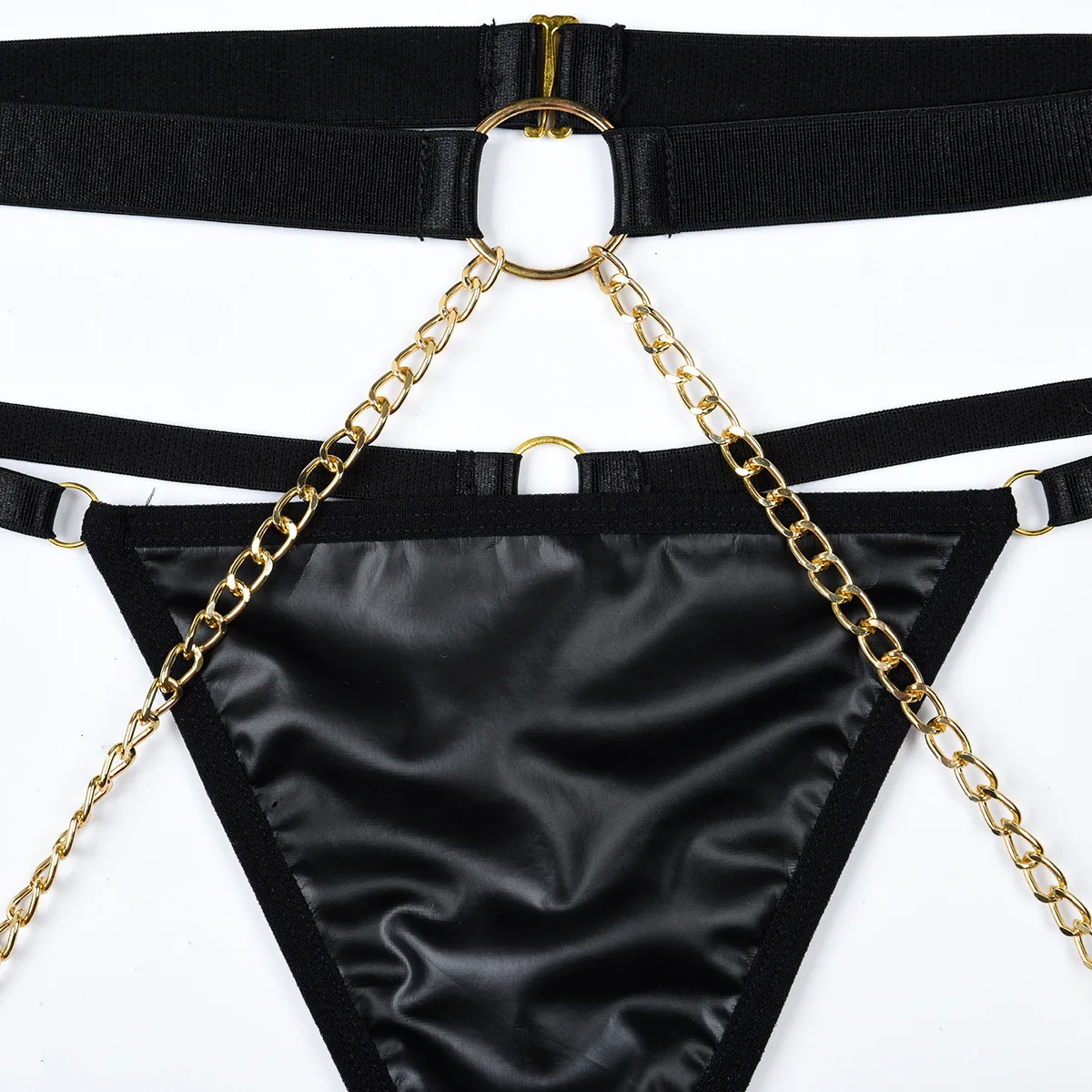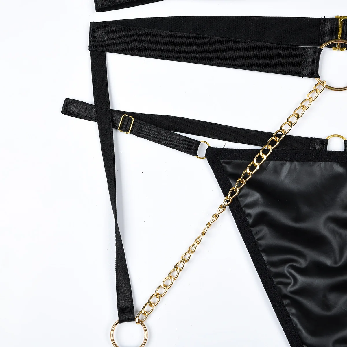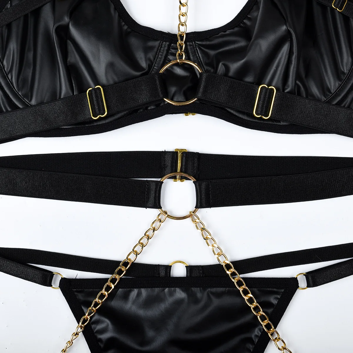Znbbw Matte Leather Female Lingerie Sexy Luxury Uncensored Underwear 6-Piece Intimate Halter Chain Fine Bra And Panty Set