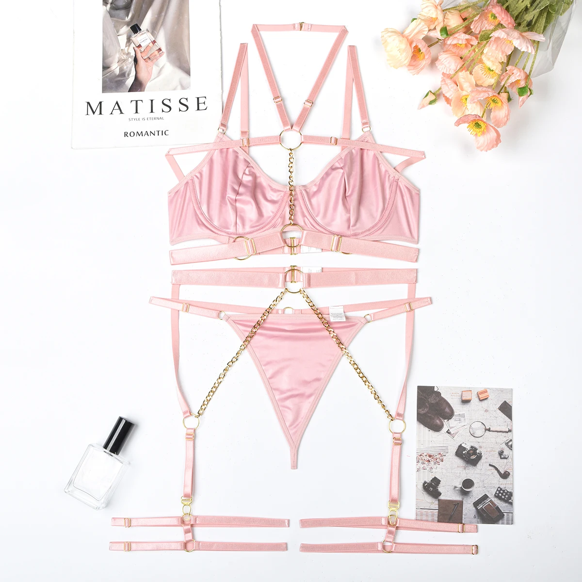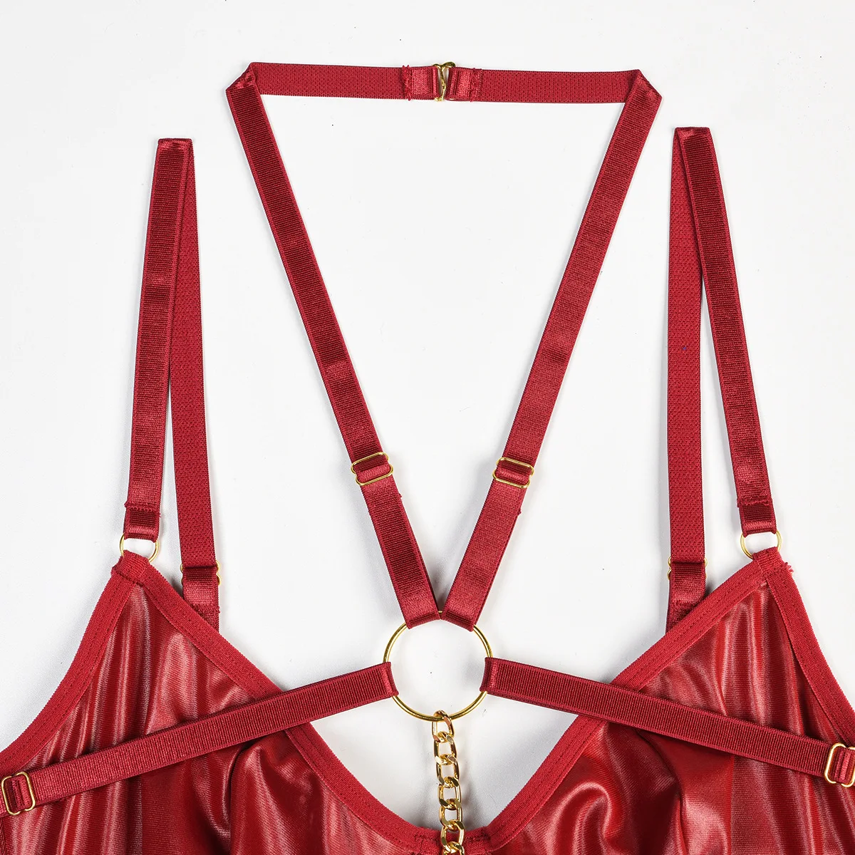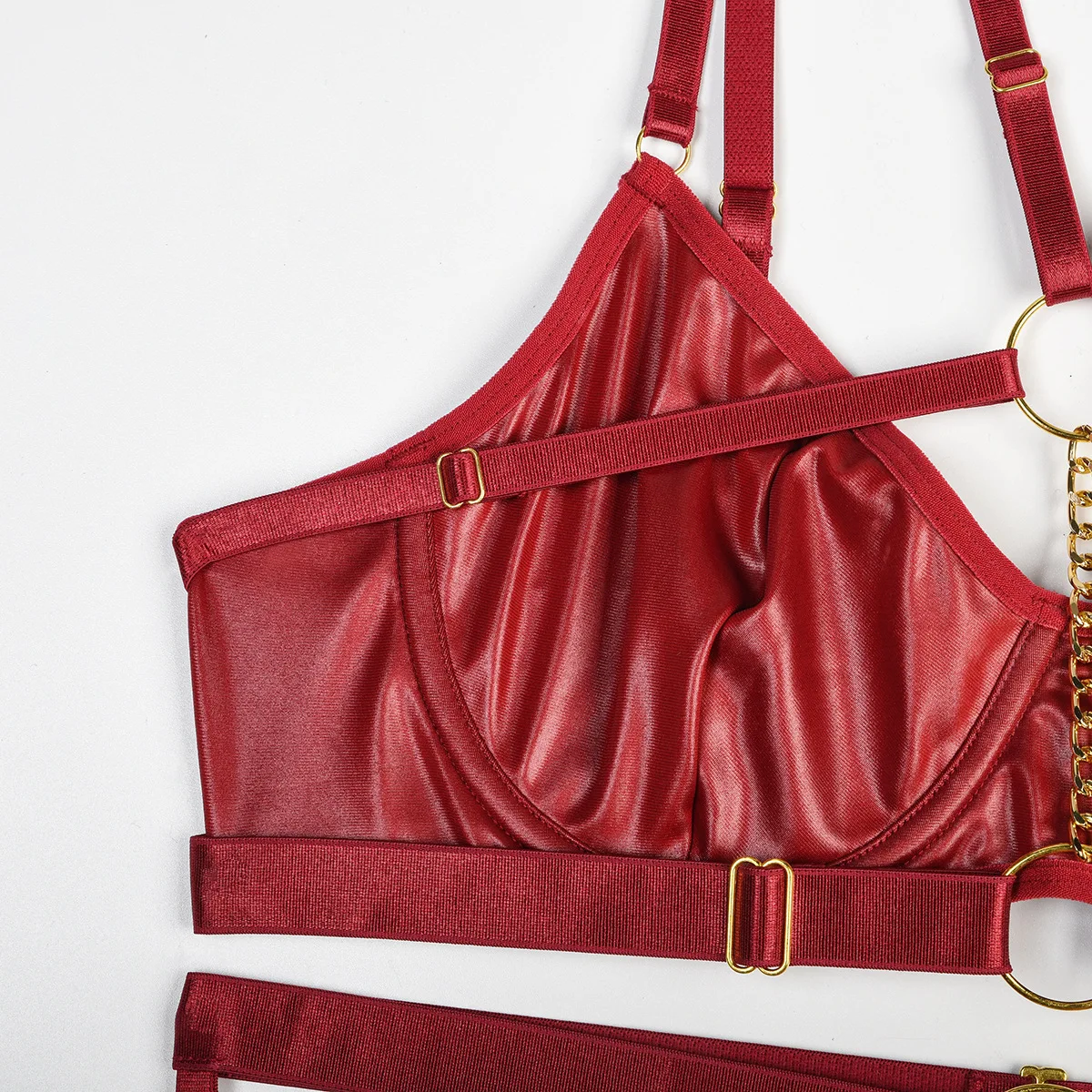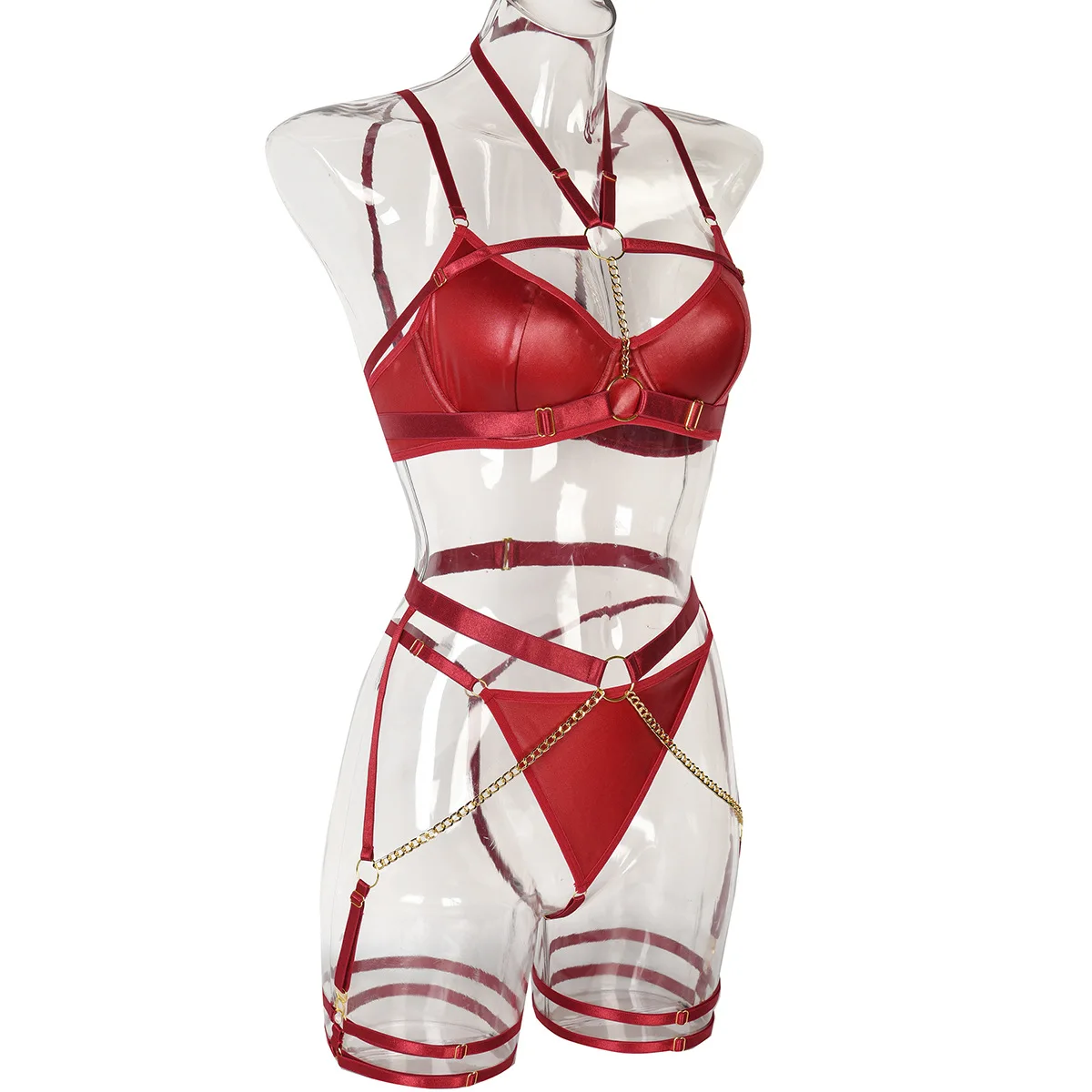 Znbbw Matte Leather Female Lingerie Sexy Luxury Uncensored Underwear 6-Piece Intimate Halter Chain Fine Bra And Panty Set