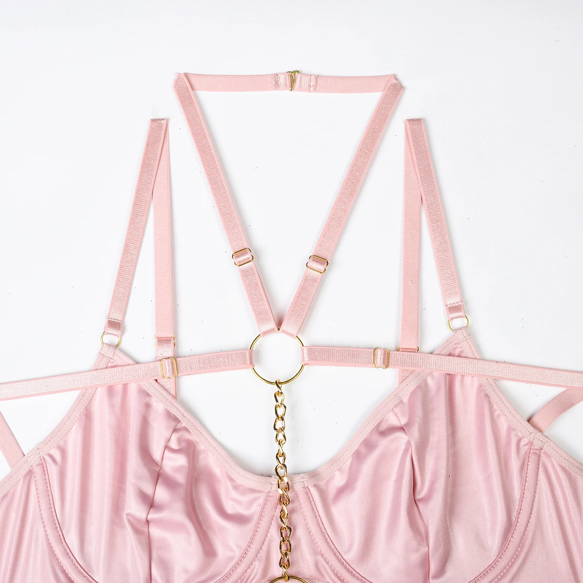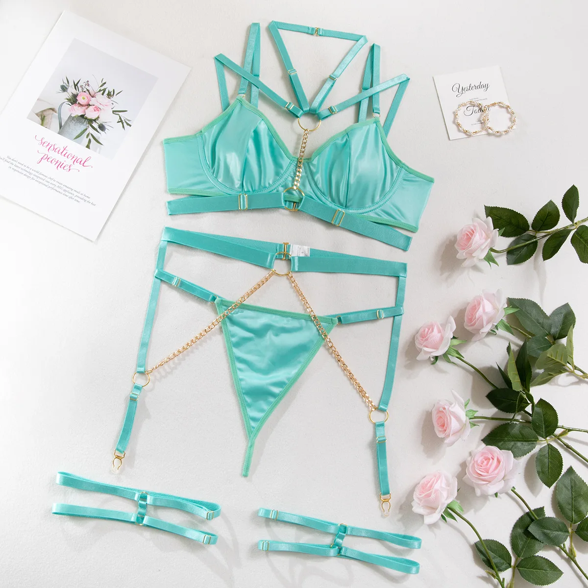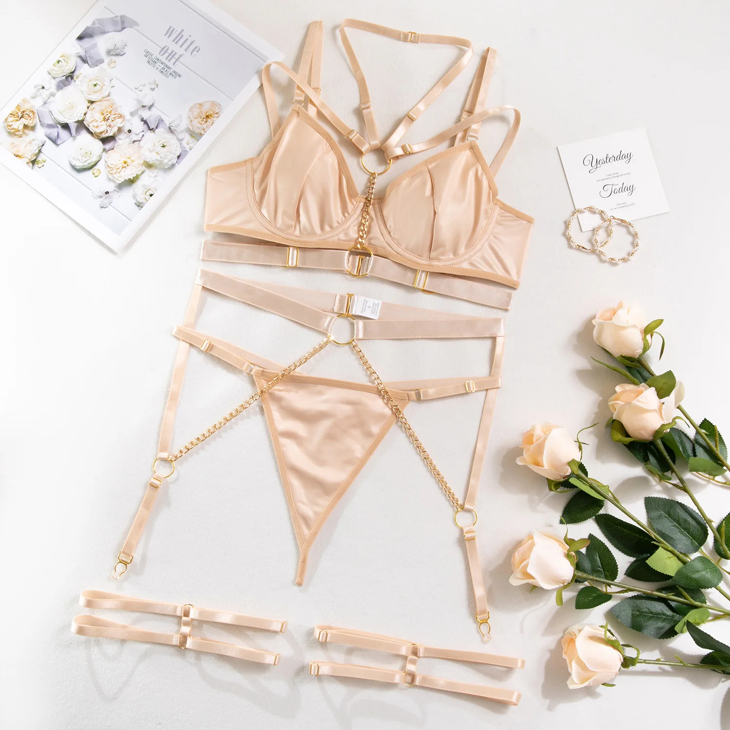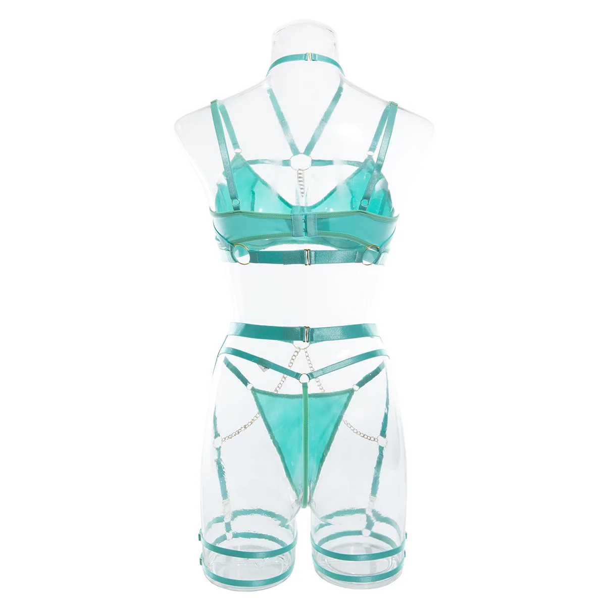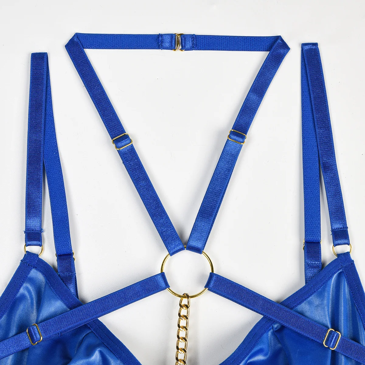 Znbbw Matte Leather Female Lingerie Sexy Luxury Uncensored Underwear 6-Piece Intimate Halter Chain Fine Bra And Panty Set