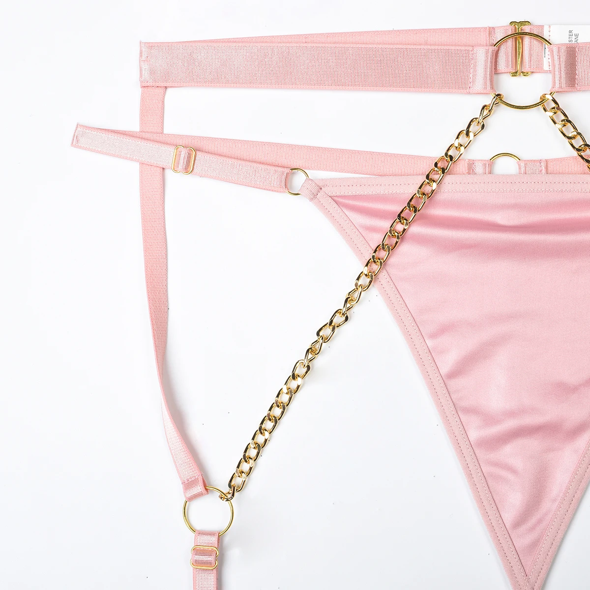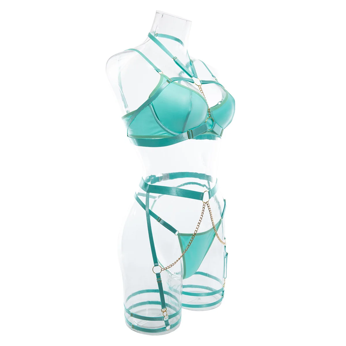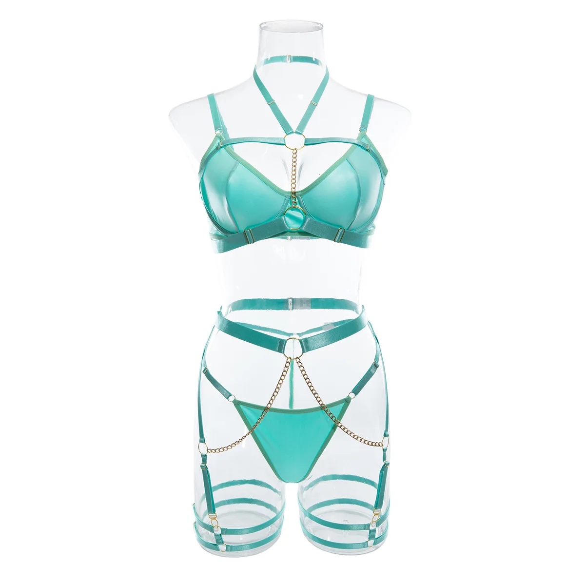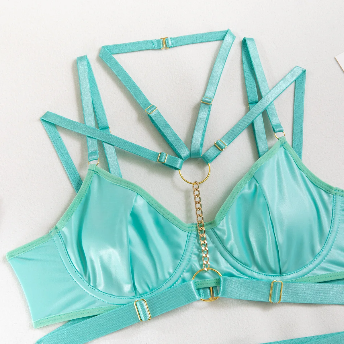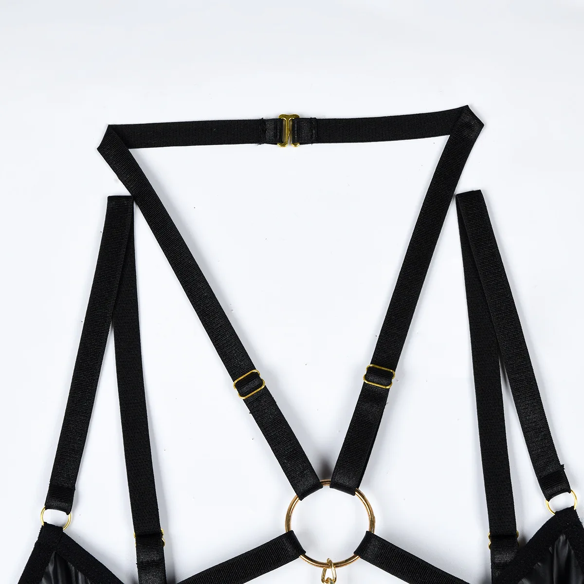 Znbbw Matte Leather Female Lingerie Sexy Luxury Uncensored Underwear 6-Piece Intimate Halter Chain Fine Bra And Panty Set