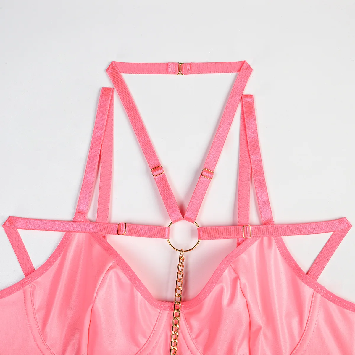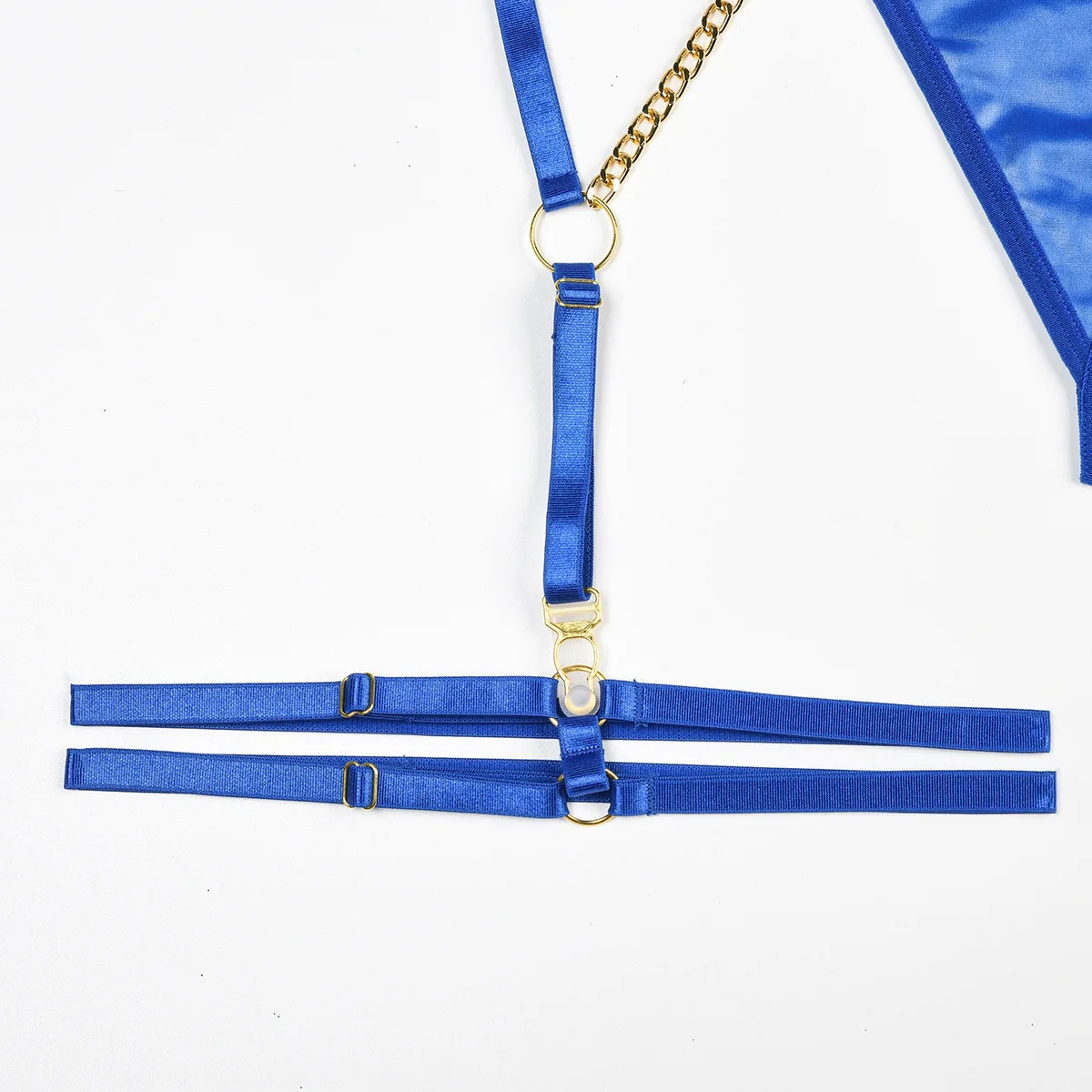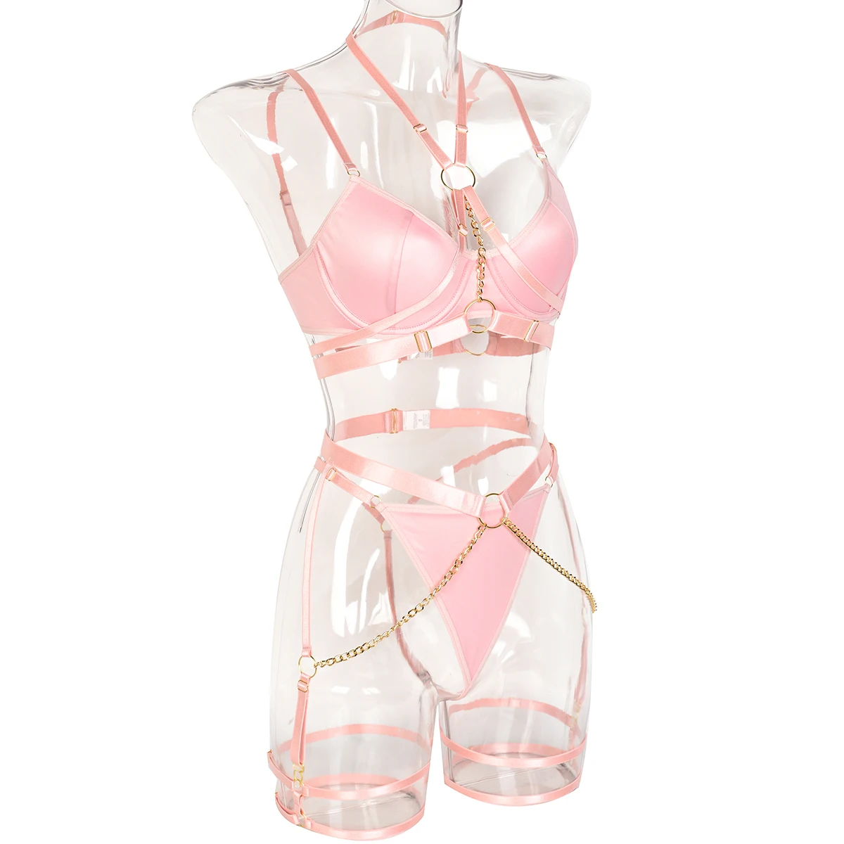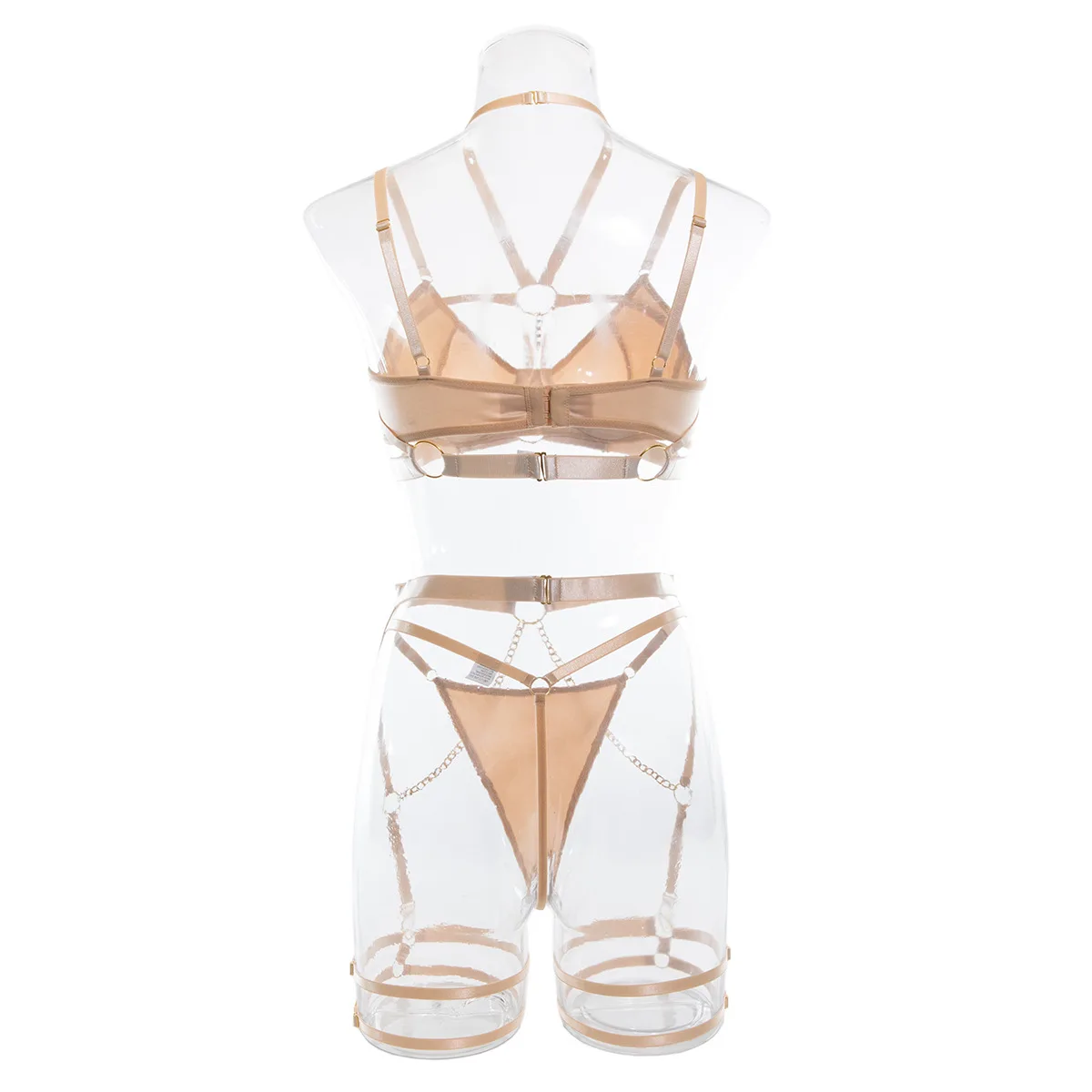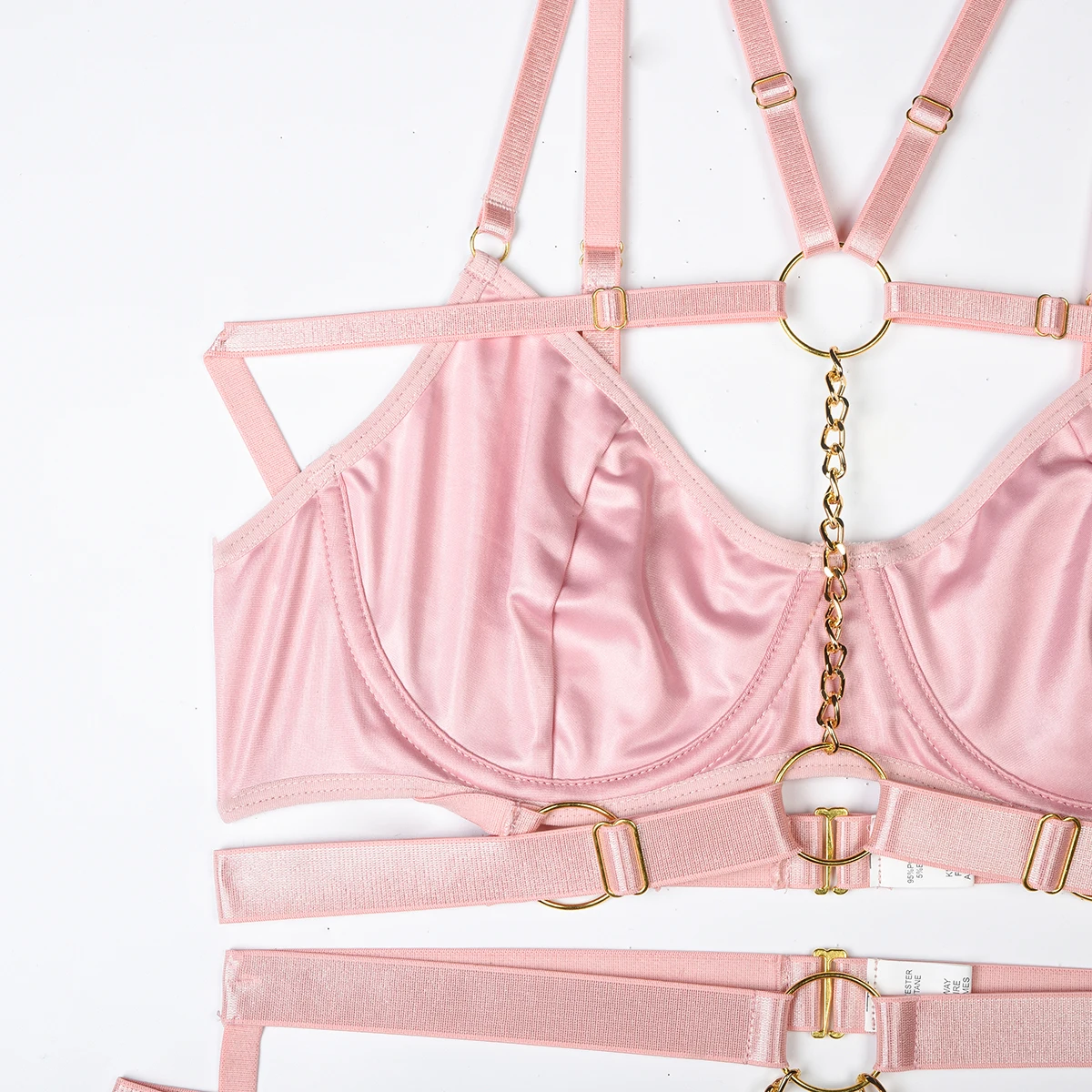 Znbbw Matte Leather Female Lingerie Sexy Luxury Uncensored Underwear 6-Piece Intimate Halter Chain Fine Bra And Panty Set