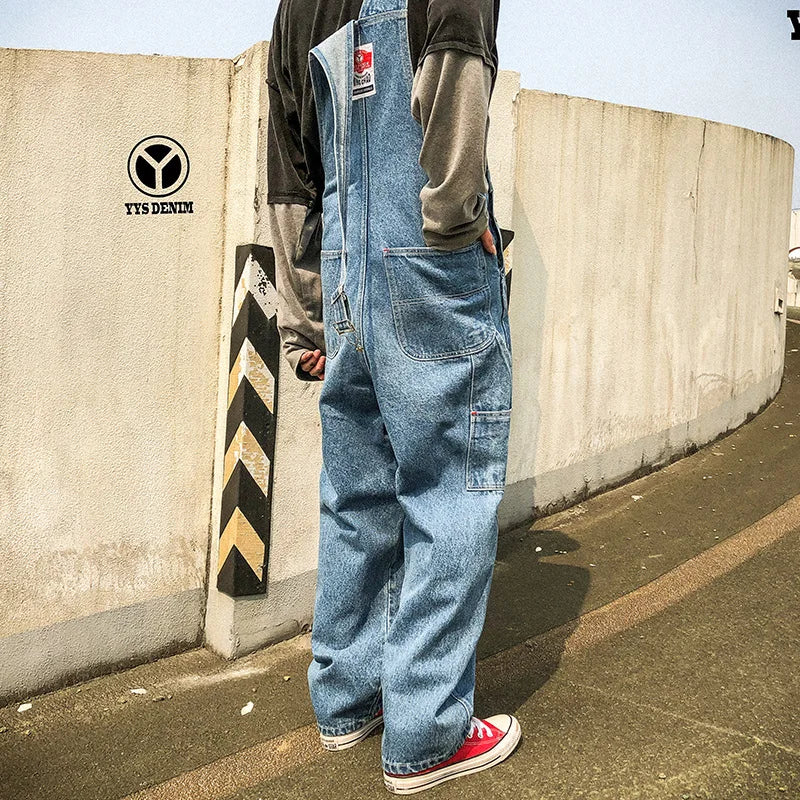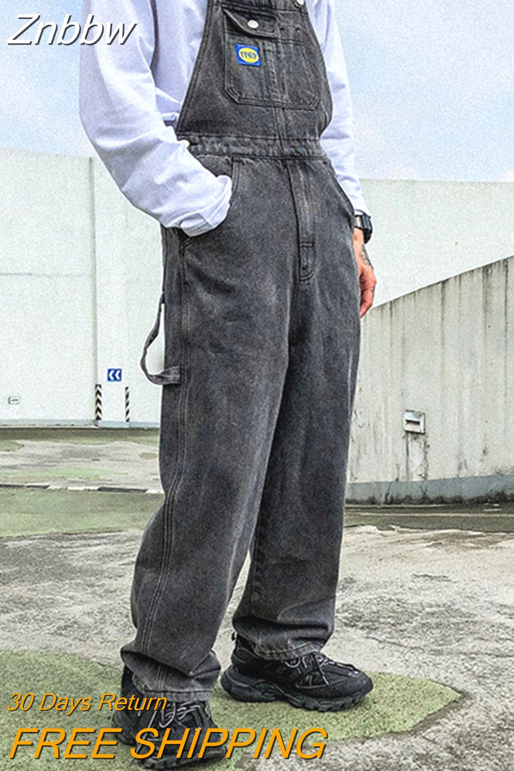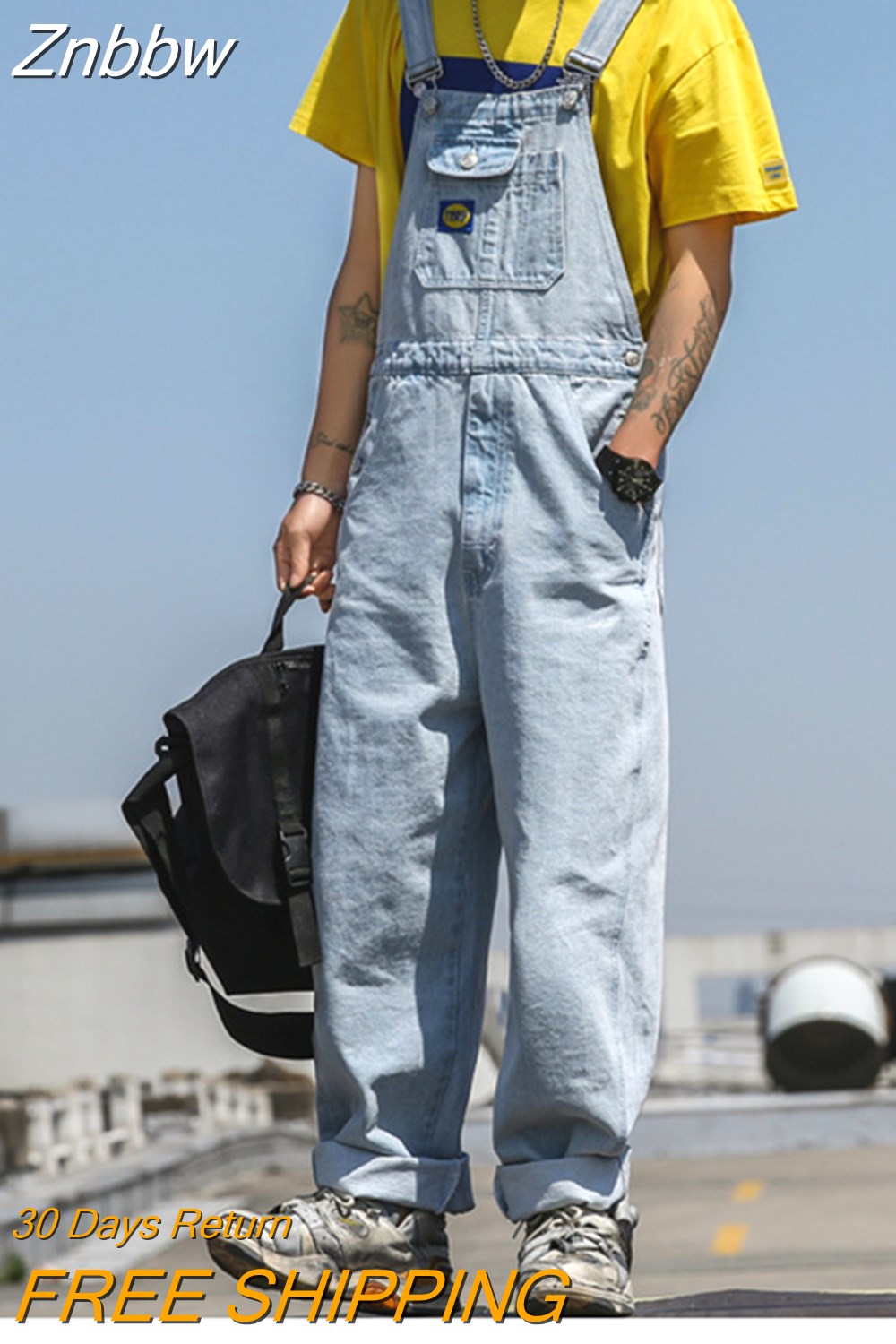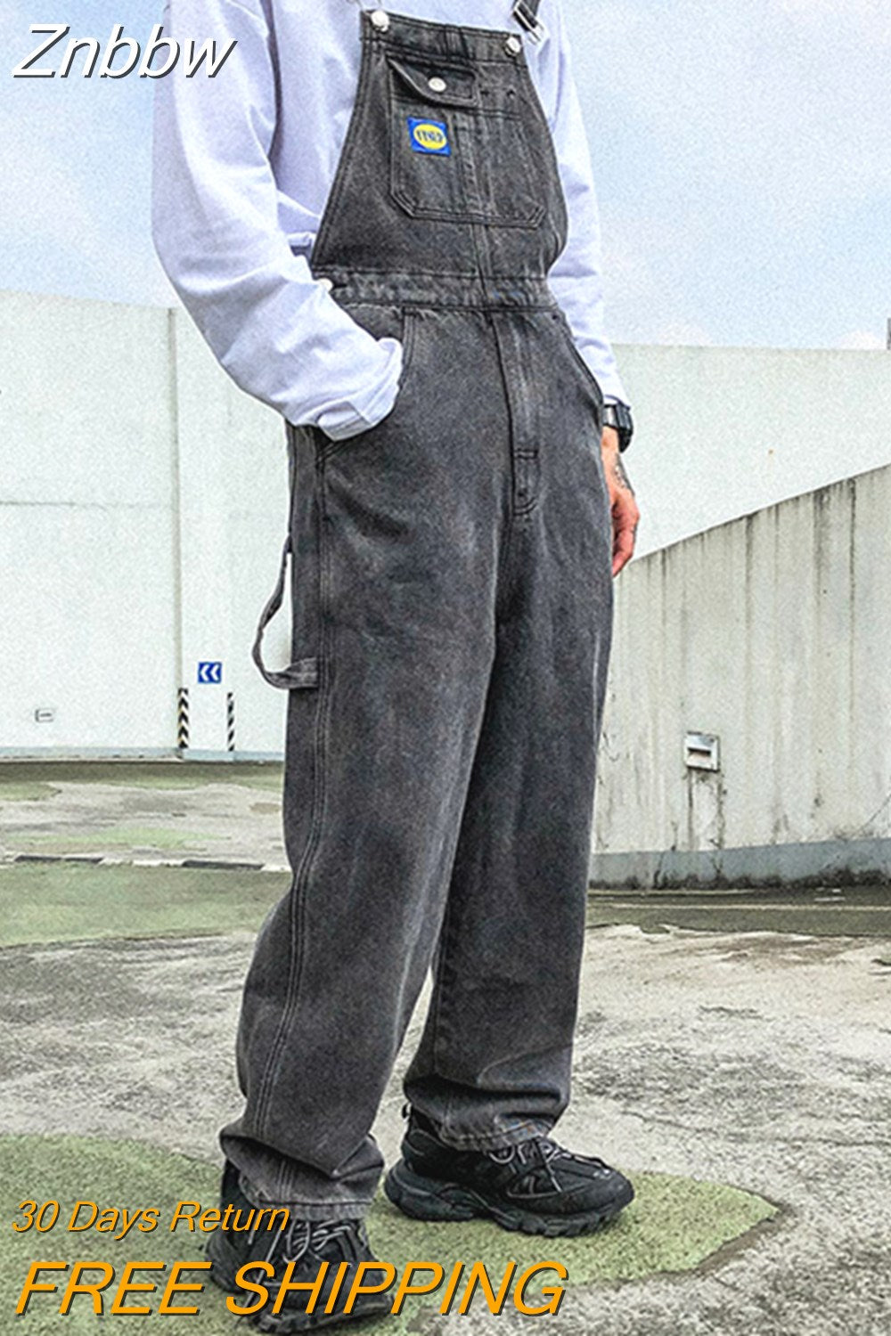 Znbbw Men Denim Jumpsuit Straight Jeans Hip Hop Big Pocket Wide Leg Cargo Pants Fashion Casual Loose Male's Rompers Trousers