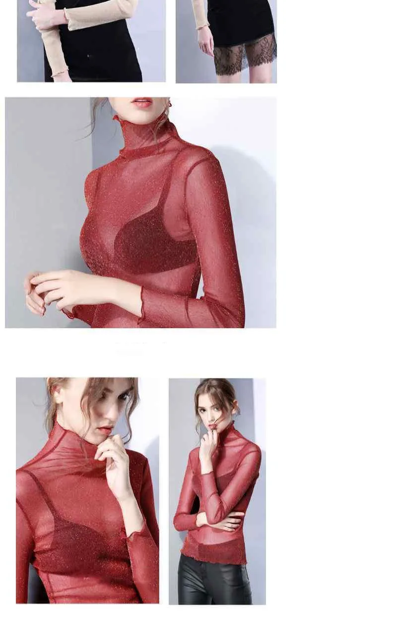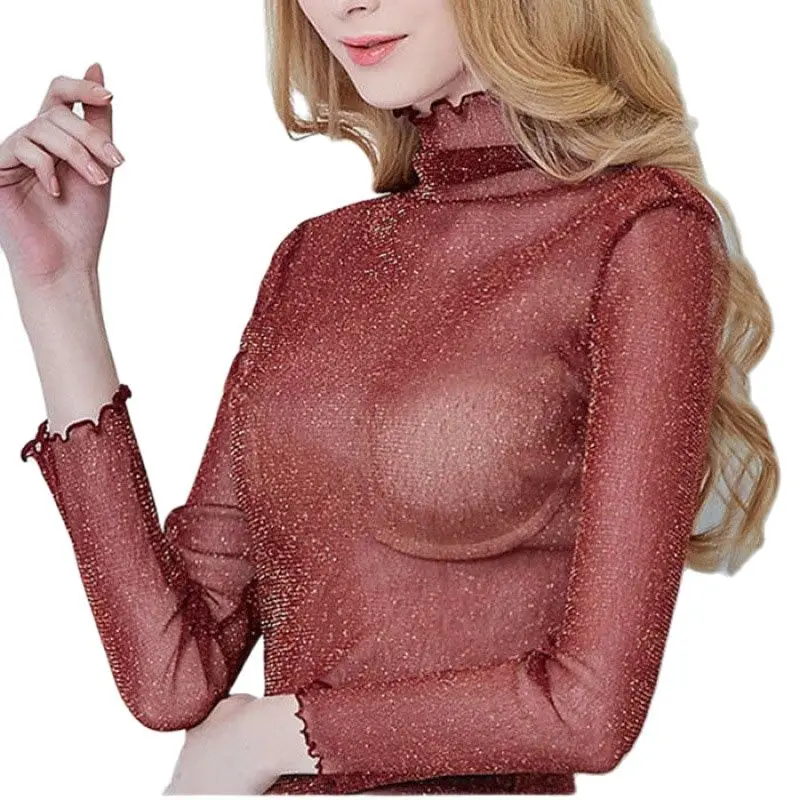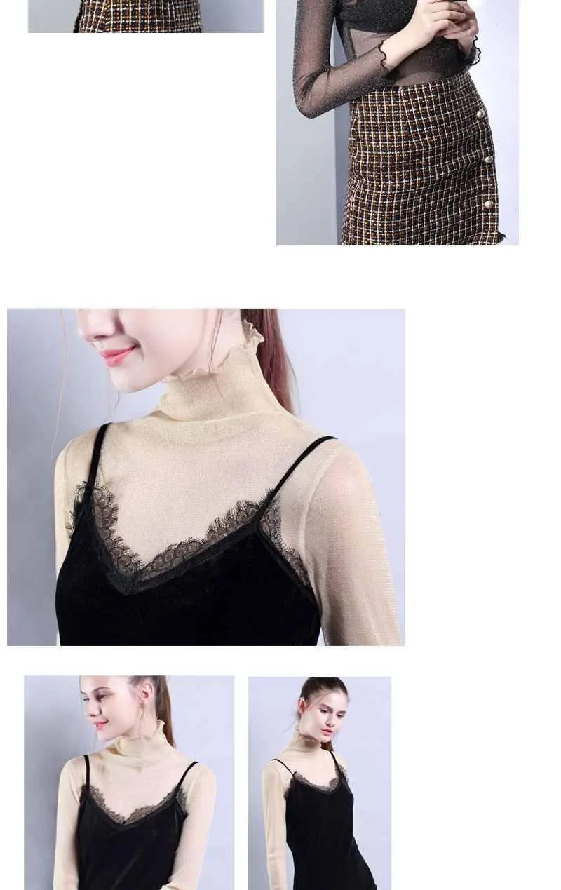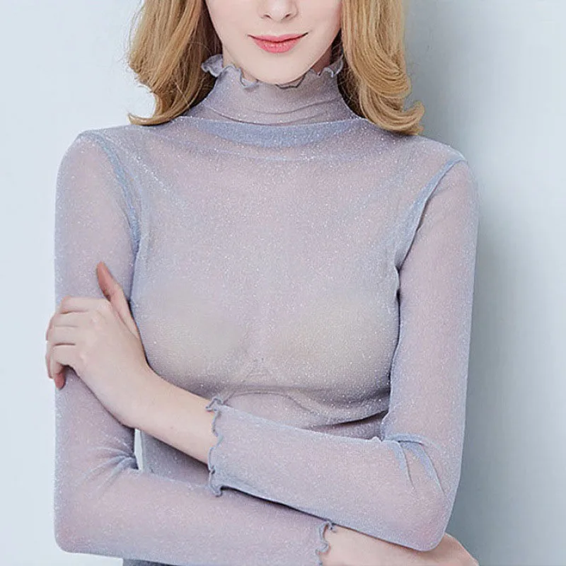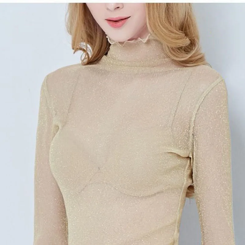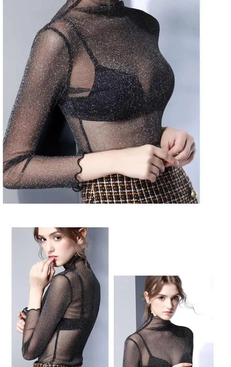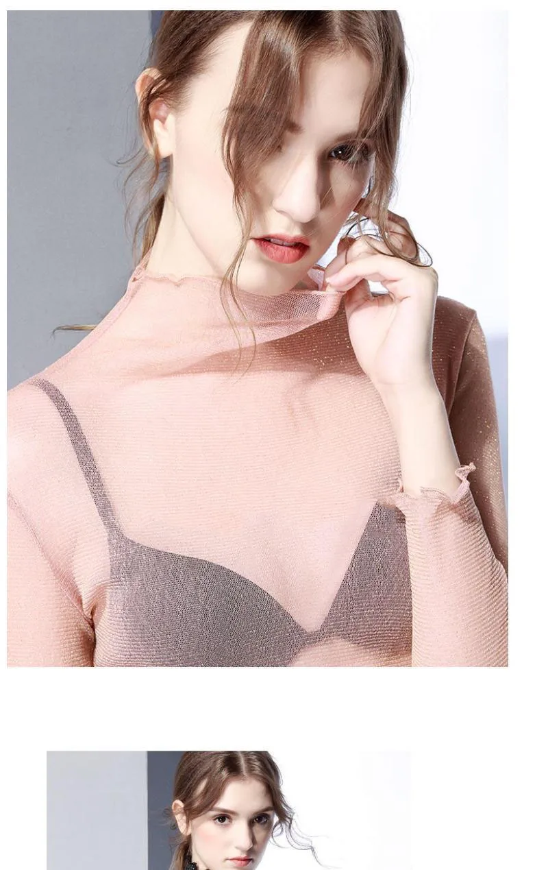Znbbw Mesh Tops Long Sleeve Woman T-shirts Female Lace Tops Transparent See Through Ladies T- Shirt Femme T-shirts