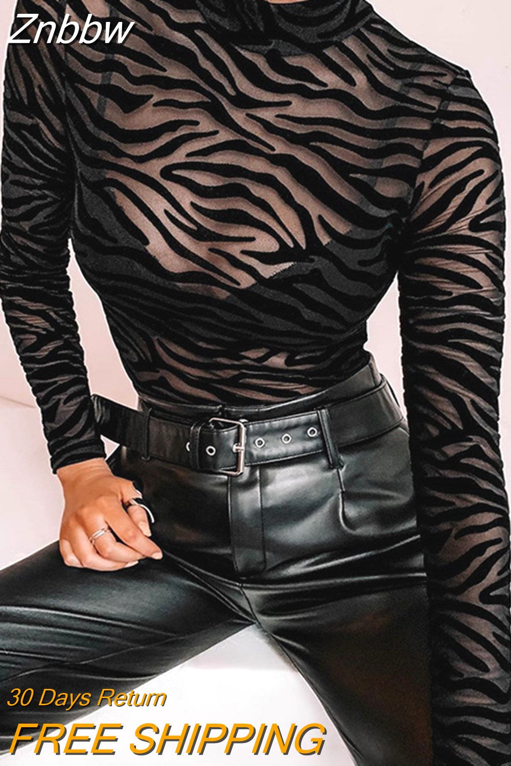 Znbbw Mesh Transparent Sexy Bodysuit Long Sleeve Slim Skinny Stripe Mock Neck Casual Rompers Women Lady Party Club Body