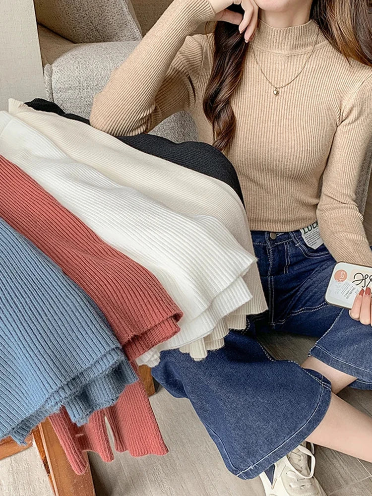 Znbbw Neck Women Sweater Vintage Basic Solid Knitted Tops Casual Slim Pullover Autumn Winter Korean Tops Simple Chic Jumpers