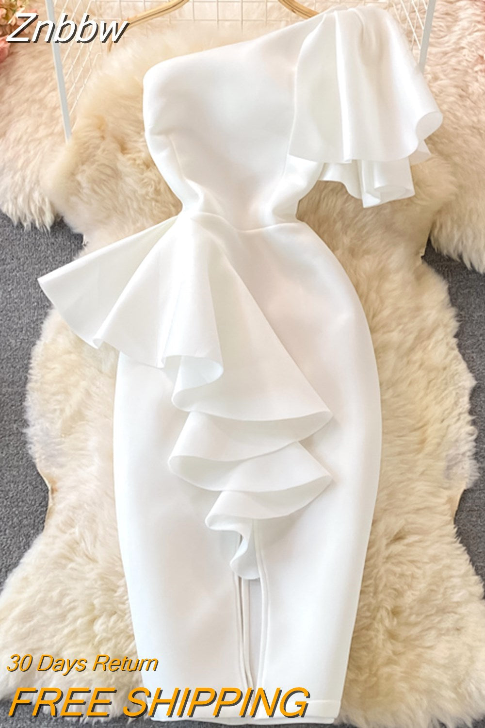 Znbbw New Fashion Vestidos Women's Diagonal Collar Three-dimensional Ruffled Waist Temperament Split Midi Dress KK321