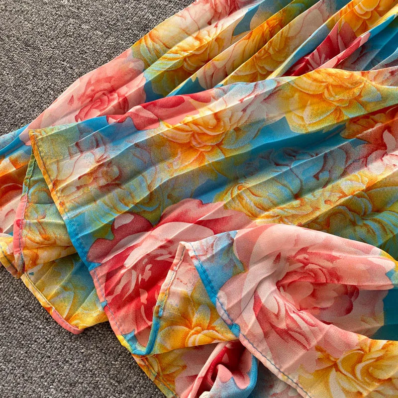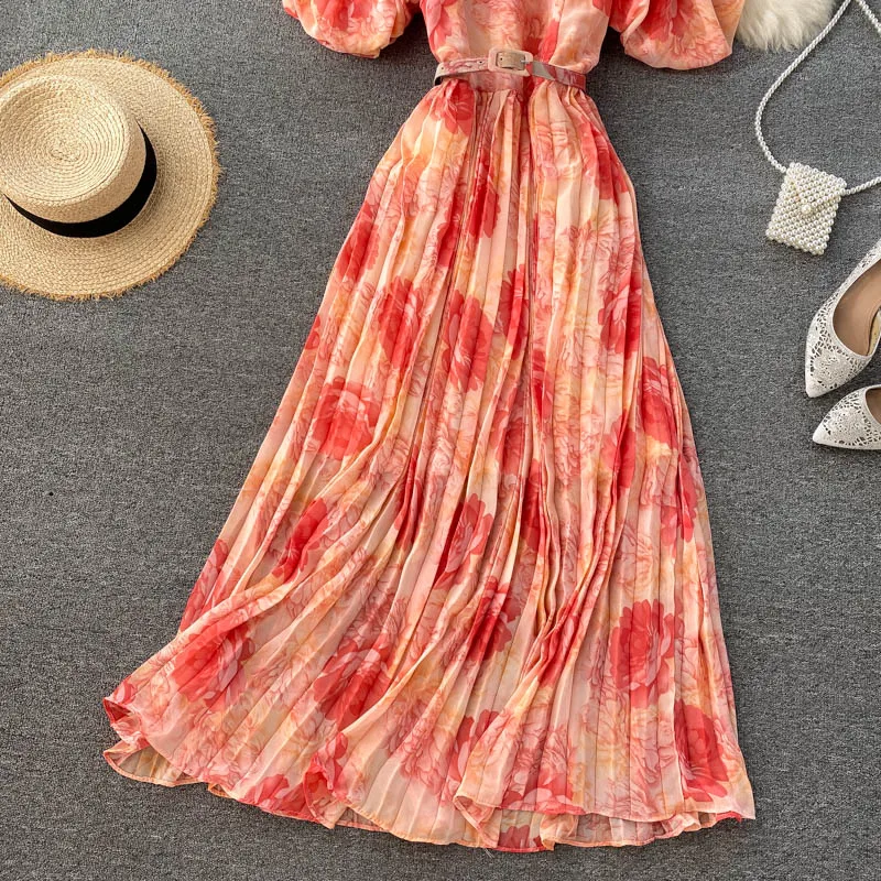 Znbbw New Seaside Holiday Dress Female Bubble Sleeve Square Neck Strapless Sling Long Print Pleated Dress UK881