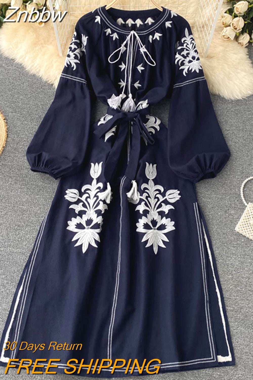 Znbbw New Spring Autumn Women's Embroidered Dress V-neck Tie Split Retro Indie Folk Style Holiday Beach Long Dress Women GD679