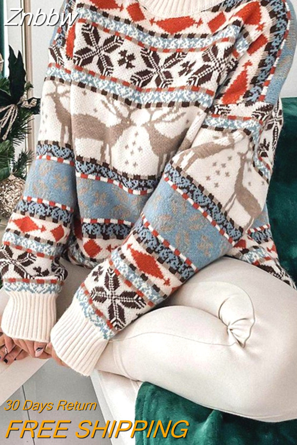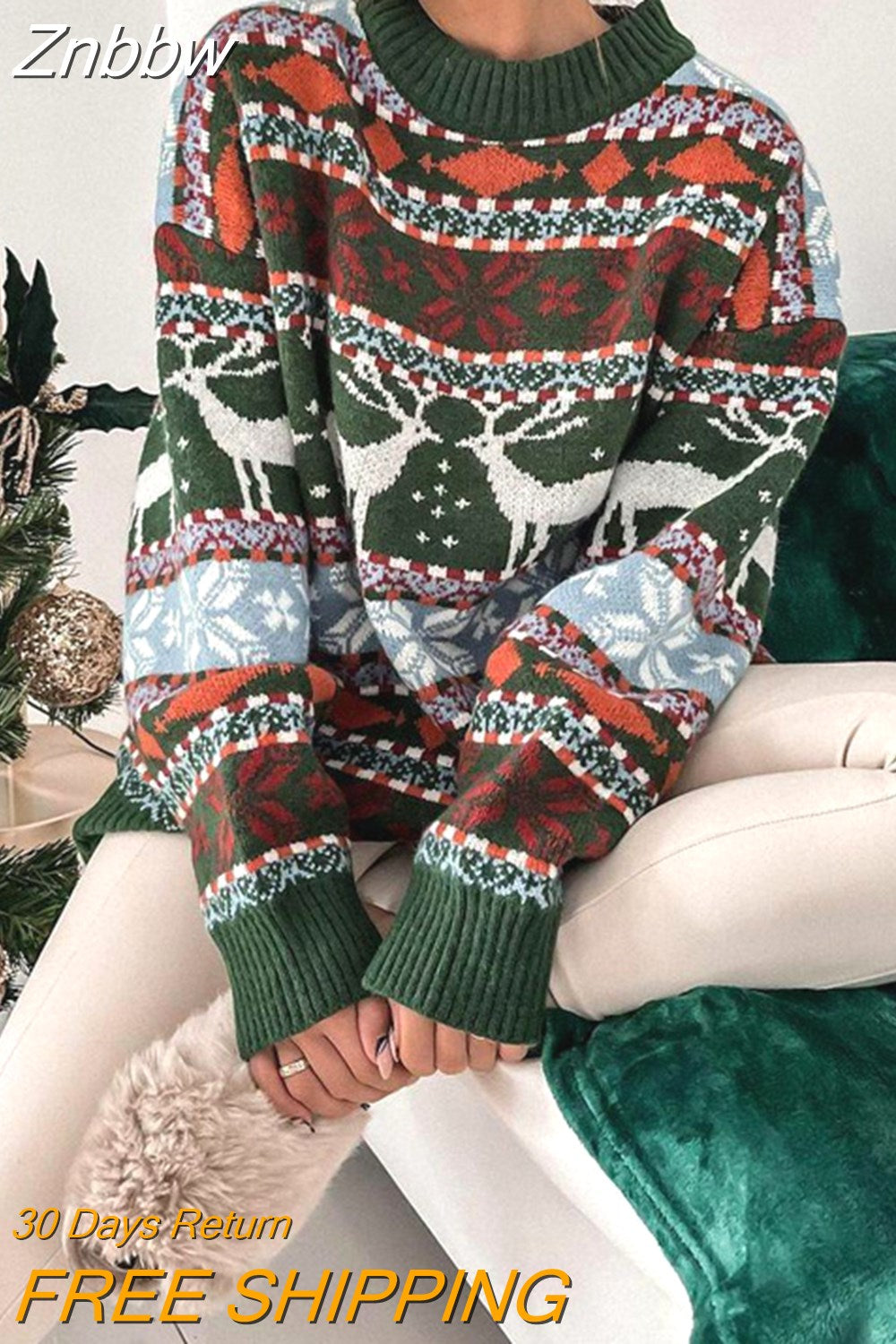 Znbbw O Neck Long Sleeve Pullover Sweater Women Autumn Fashion Christmas Printed Sweater Ladies Commuter Loose Sweater 2023 New