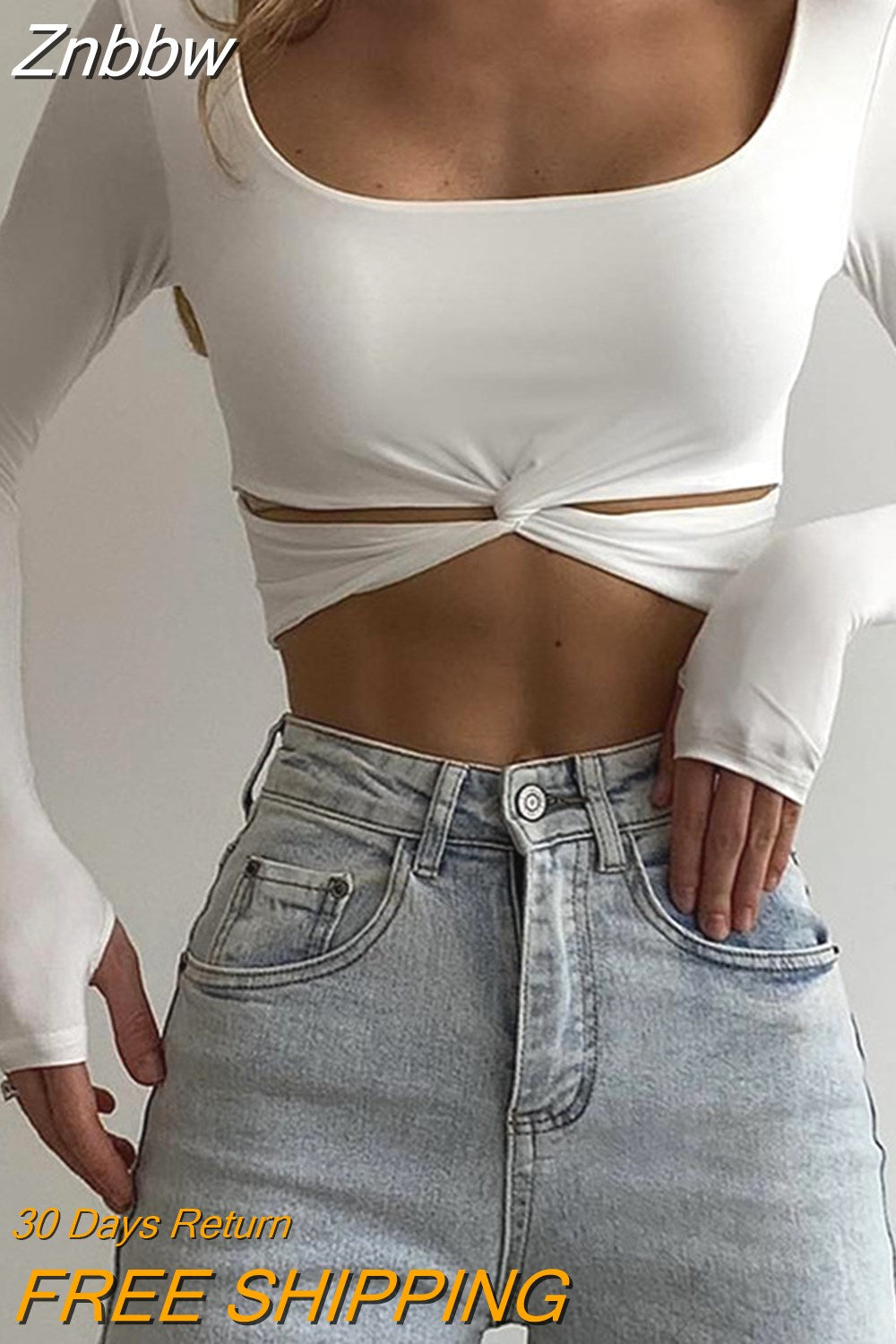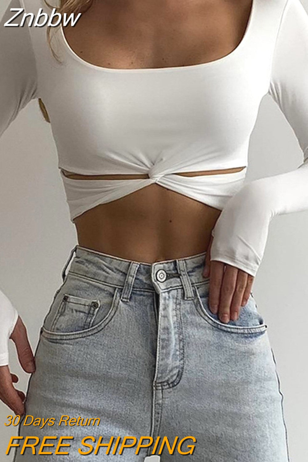 Znbbw O-Neck Twist Hollow Out Crop Top T-Shirts for Women Long Sleeve Thumb Holes Fall Outfits Streetwear Slim T Shirt