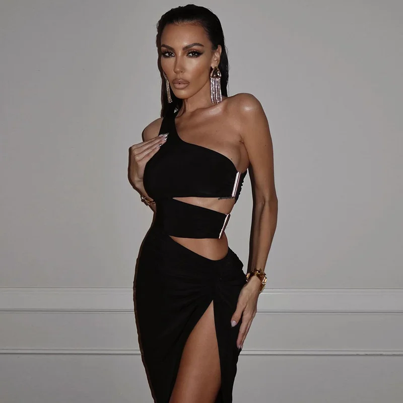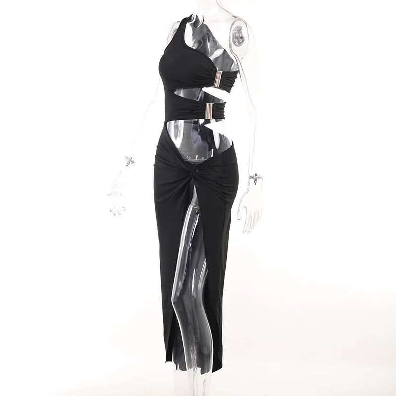 Znbbw One Shoulder Hollow Out High Split Midi Dress For Women Robe Elegant Sleeveless Backless Sexy Party Long Dress Vestido