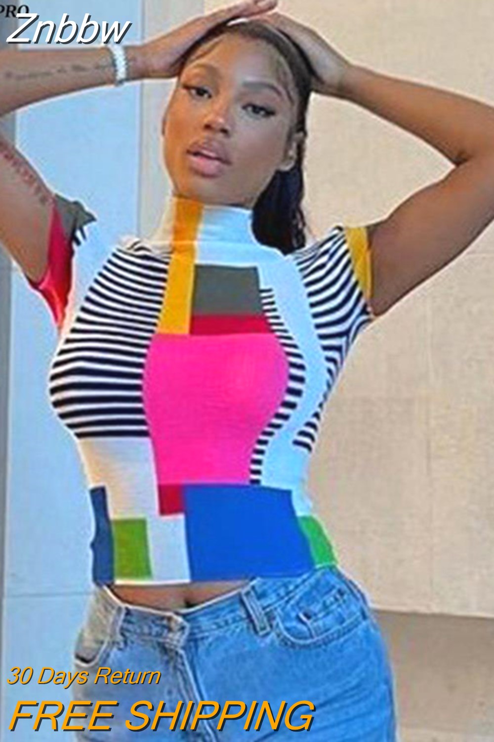 Znbbw Patchwork Printed Turtleneck T-Shirt Women Fashion Streetwear Short Sleeve Tops 2023 Summer Ladies Elegant Tee Shirts