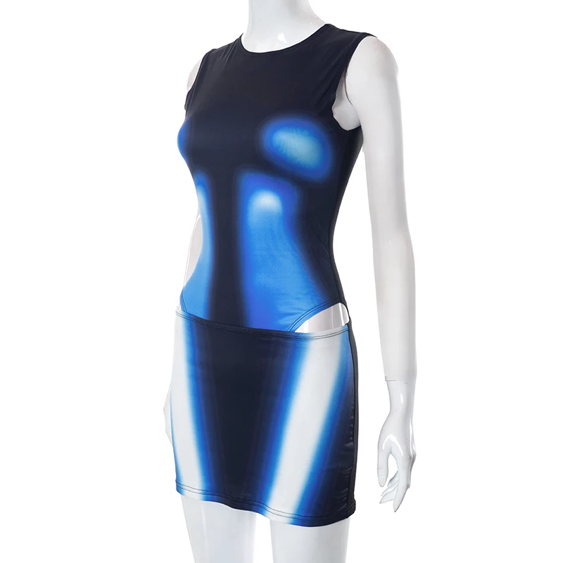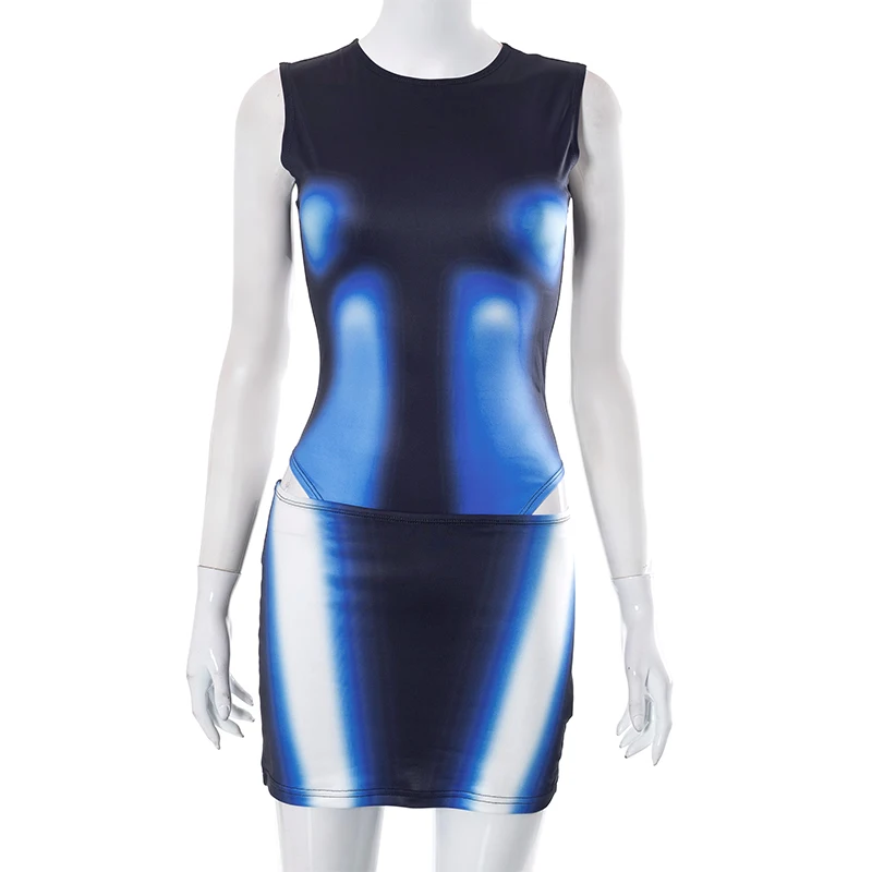 Znbbw Piece Set Women 3D Body Print Outfits Sexy Sleeveless Bodysuits+High Waist Mini Skirts 2023 Summer Fairy Grunge Clothes