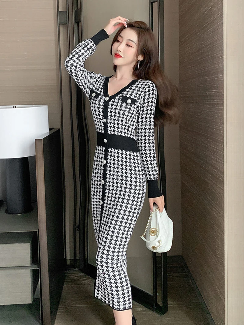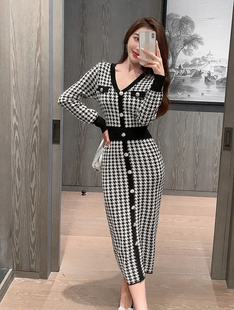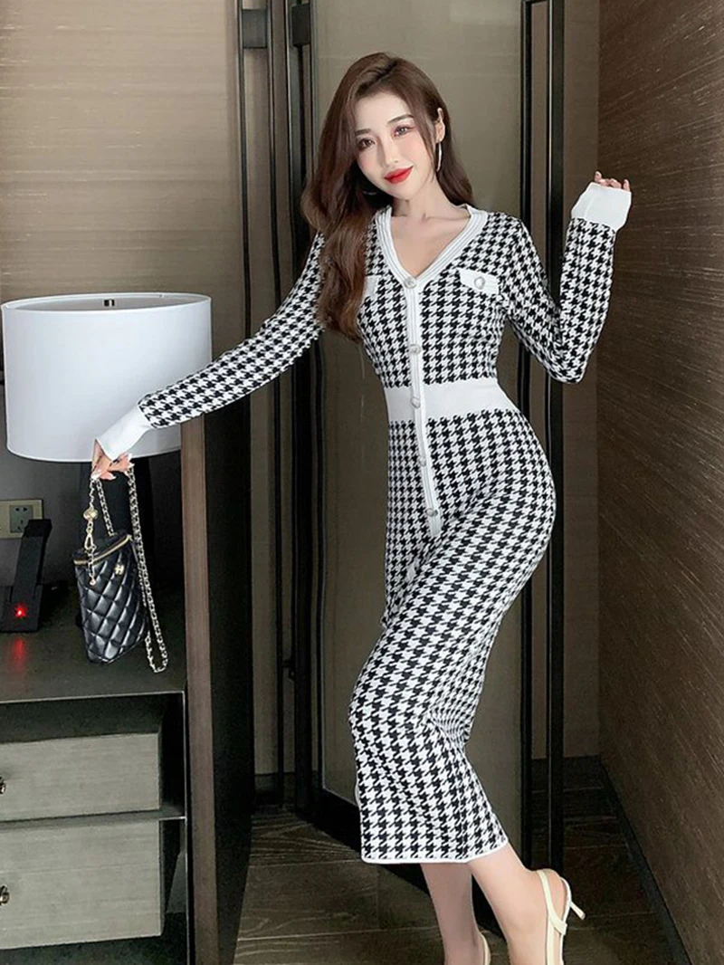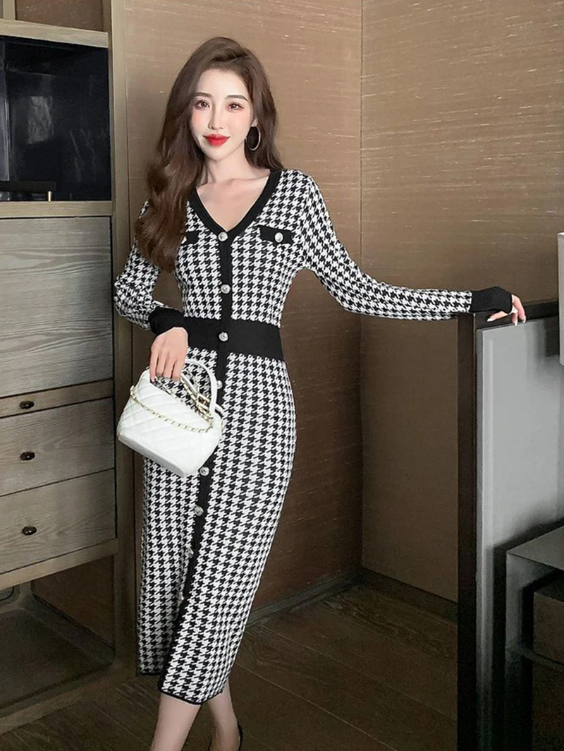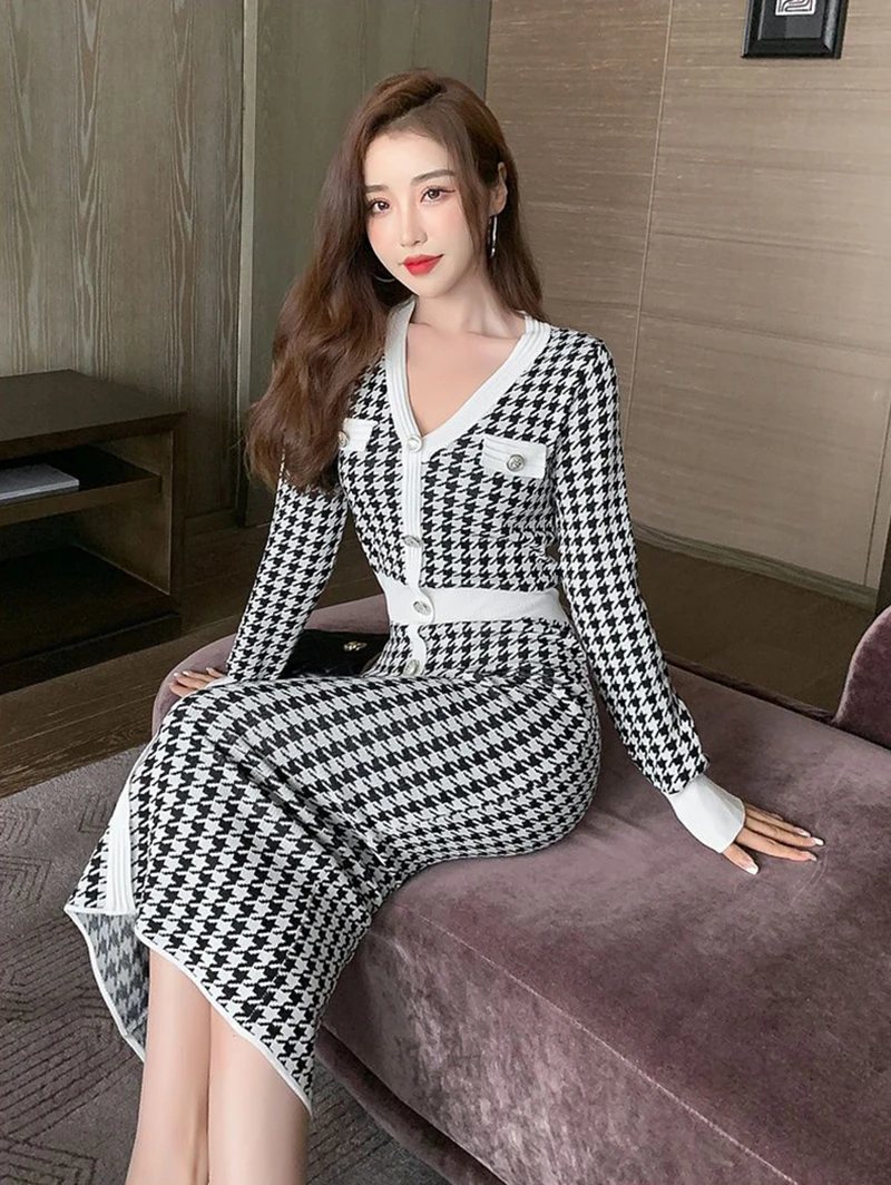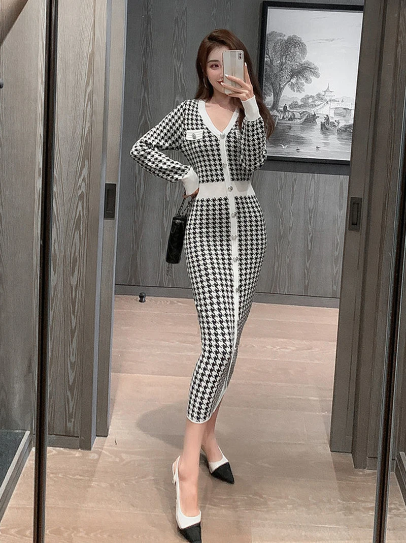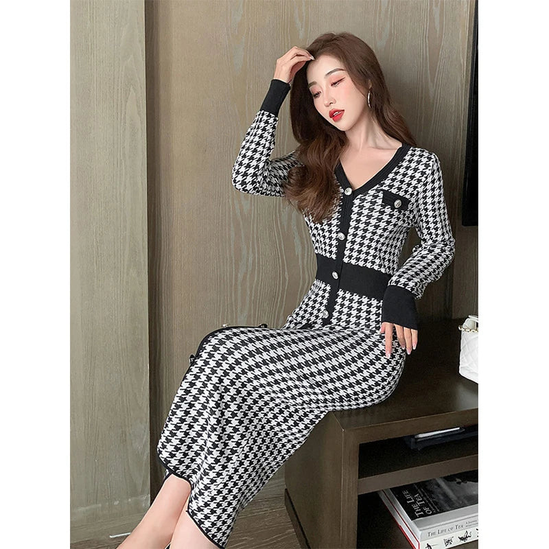 Znbbw Plaid Knitted Midi Dress Women Bird Lattice Sweater A Line Dresses Korean Elegant V Neck Patchwork Bodycon Vestidos New